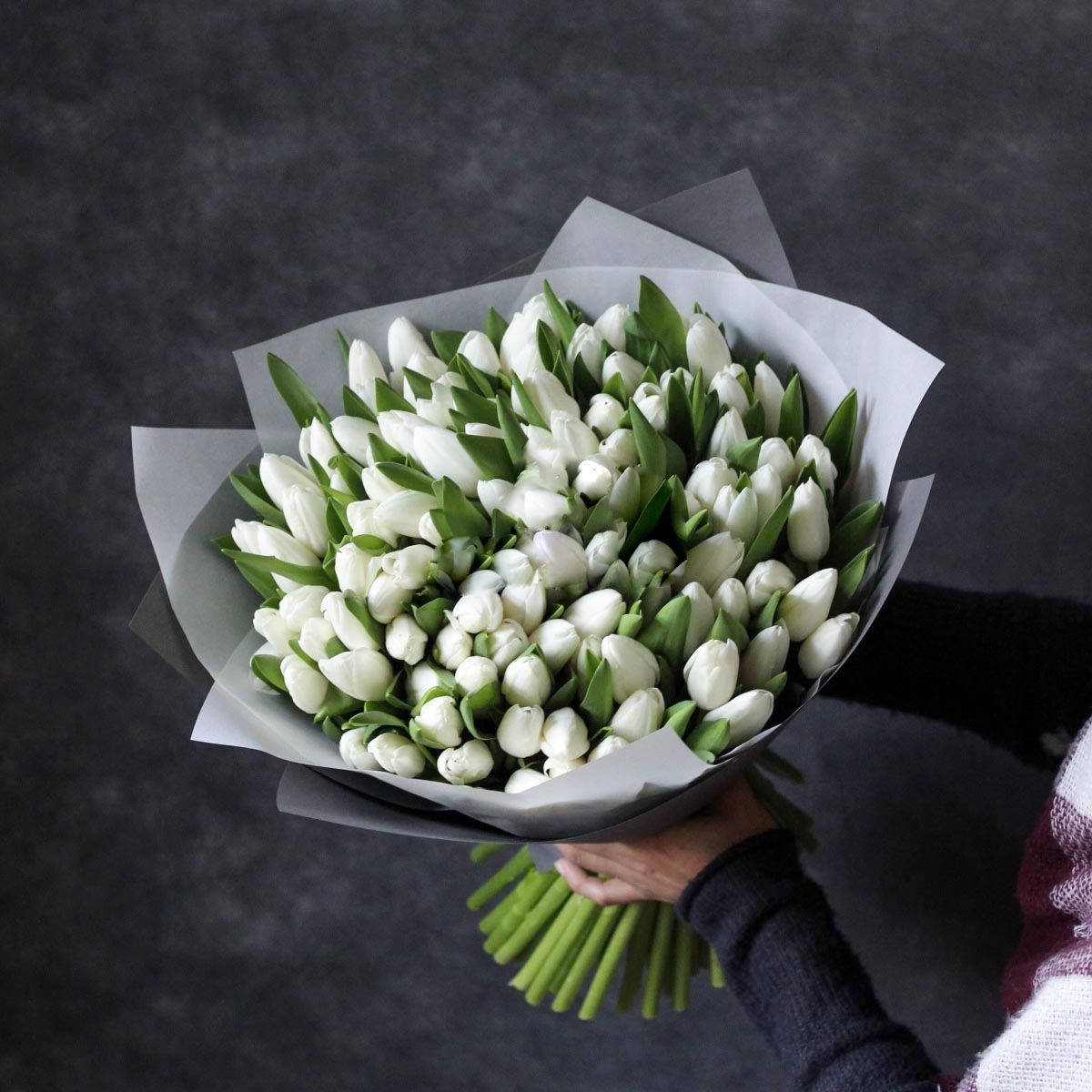 Сто один белый бутон образует впечатляющую композицию с выразительным силуэтом. Монохромное решение подчёркивает архитектуру букета и его визуальное присутствие в пространстве.