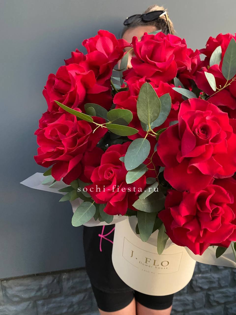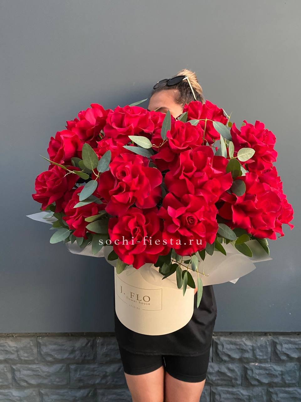 Насыщенный алый цвет роз традиционно ассоциируется с глубокой страстью, сильной любовью и восхищением. Такой подарок несет в себе мощный эмоциональный посыл и предназначен для создания драматического и торжественного эффекта.