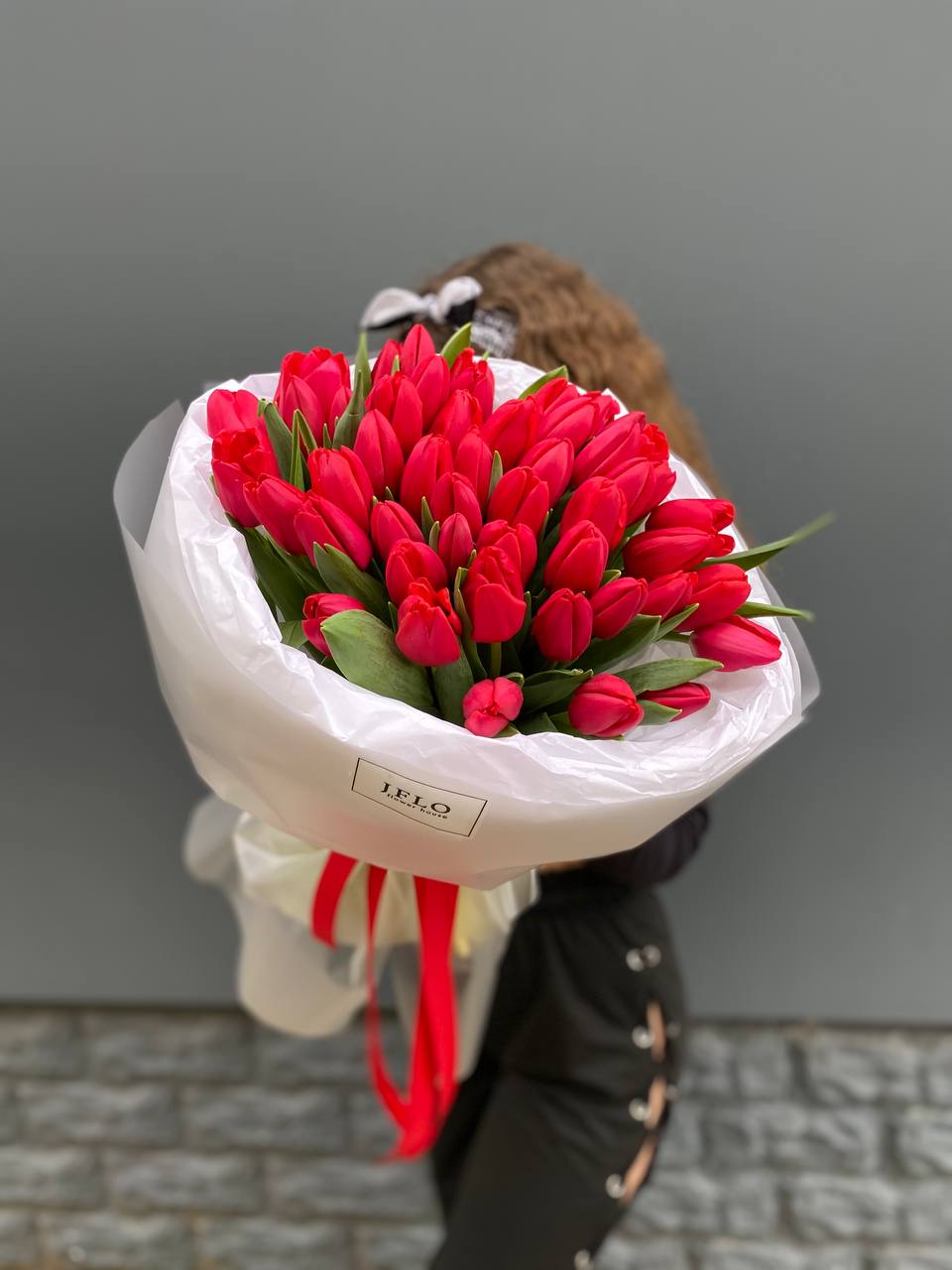 Яркая волна из 51 красного тюльпана в лаконичной упаковке. Плотная сборка создает насыщенное цветовое пятно, которое преображает пространство одним движением. Весенняя энергия в максимальной концентрации.