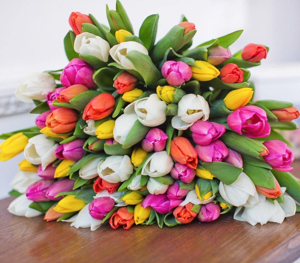 Семьдесят девять бутонов в живой палитре от алого до сиреневого создают объемную композицию Rainbow. Цветовые переходы складываются в динамичный весенний ритм.