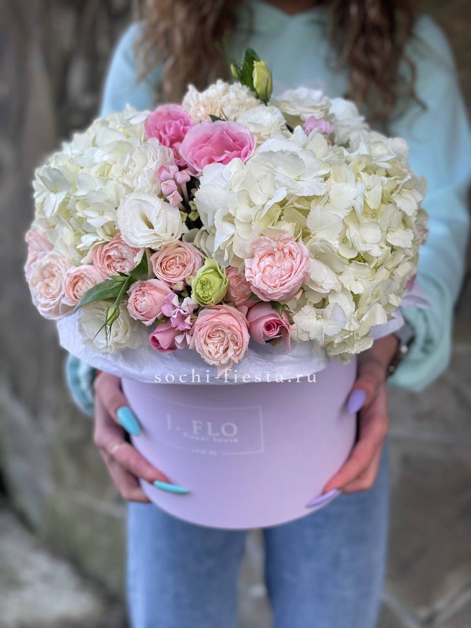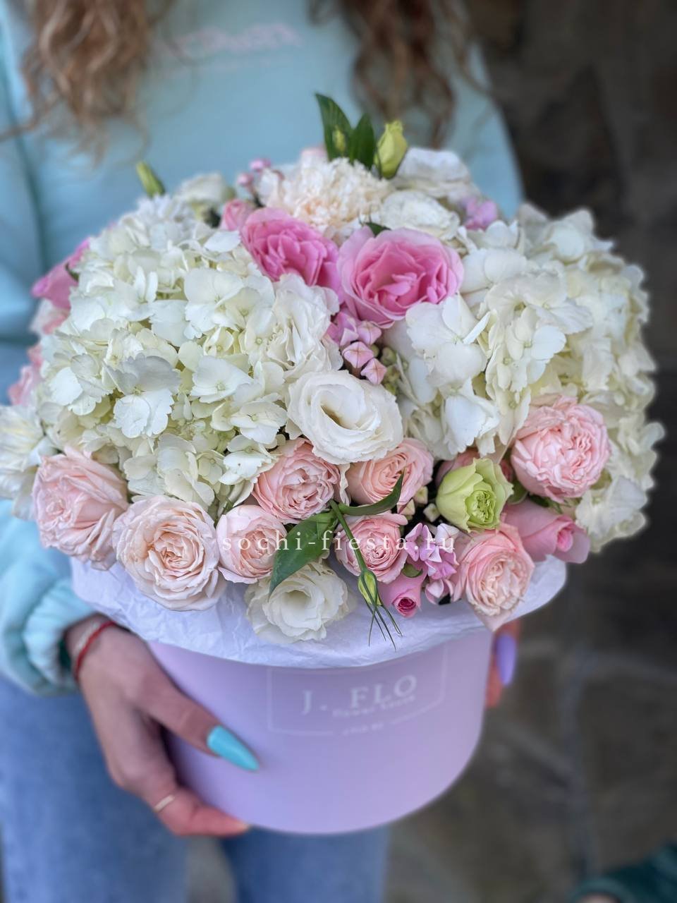 гортензия нежно-розовых оттенков, эустома, львиный зев или маттиола, розовые розы, эвкалипт, вспомогательная зелень, лента, светлая корзин.
