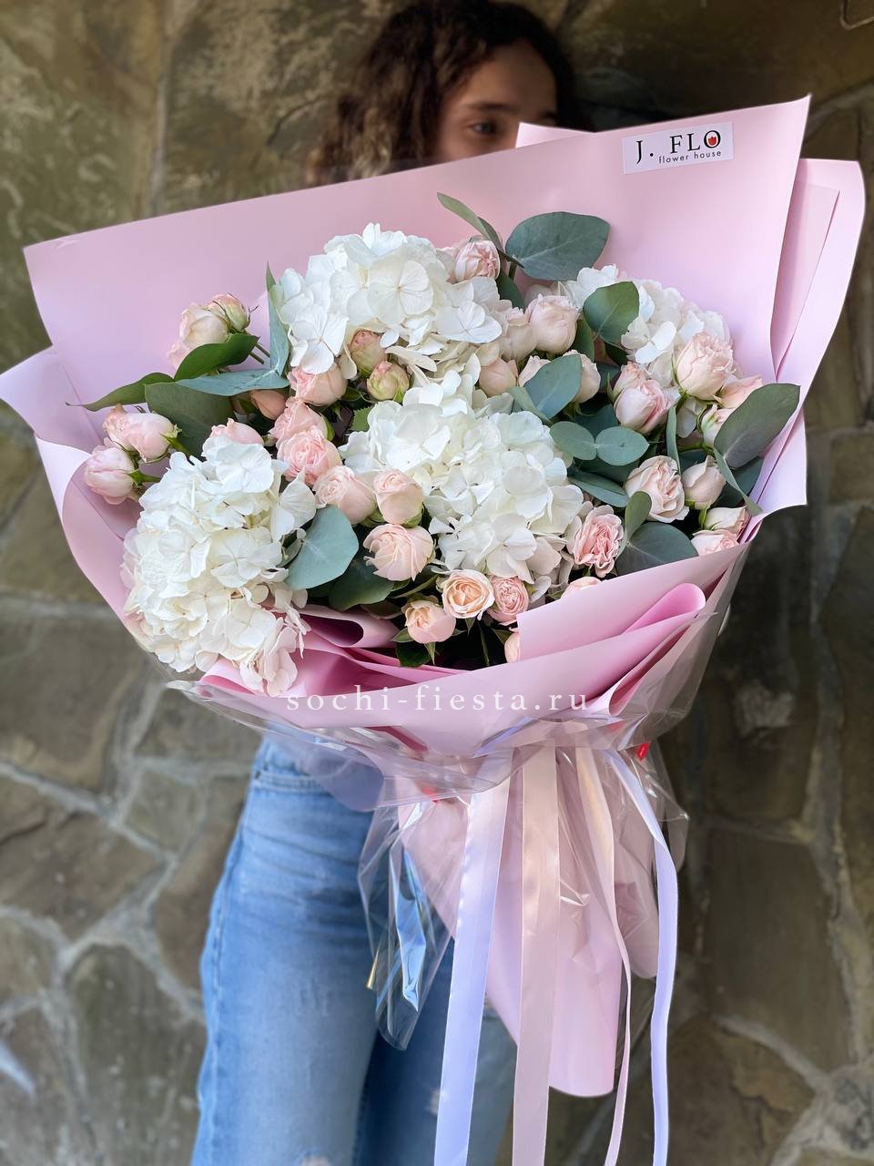 гортензия, розовые розы, пионовидные розы, диантус, эвкалипт, лента, сумка-кашпо.