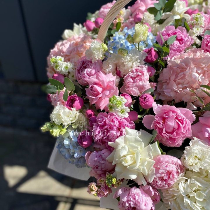 - Пионовый гигант — букет из 50-70 крупных пионов для майского-июньского сезона.