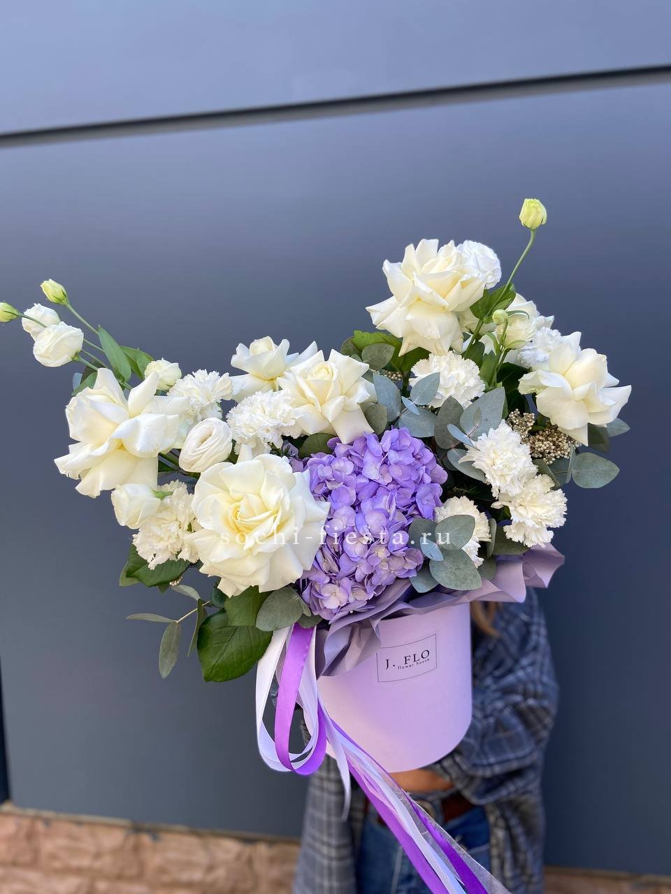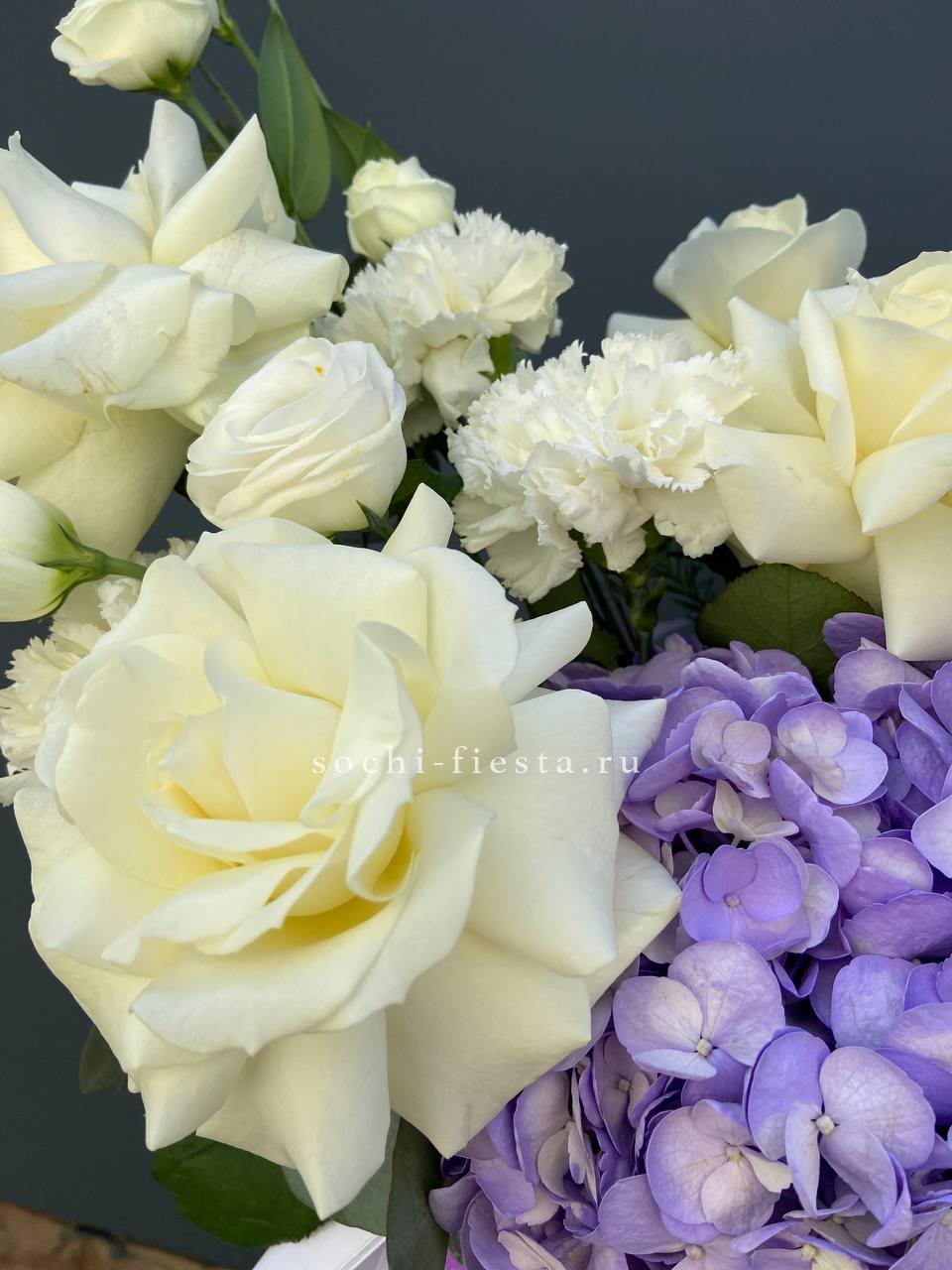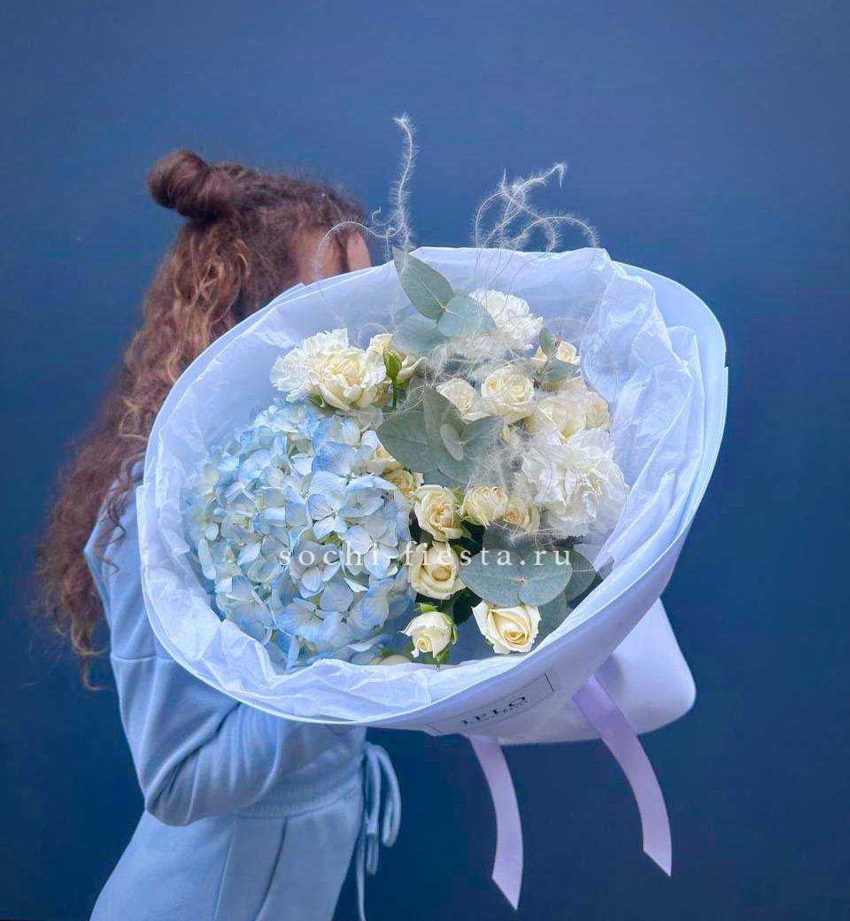 гортензия, вывернутые розы, диантус, кустовая роза, диантусы, оформление в боксе.