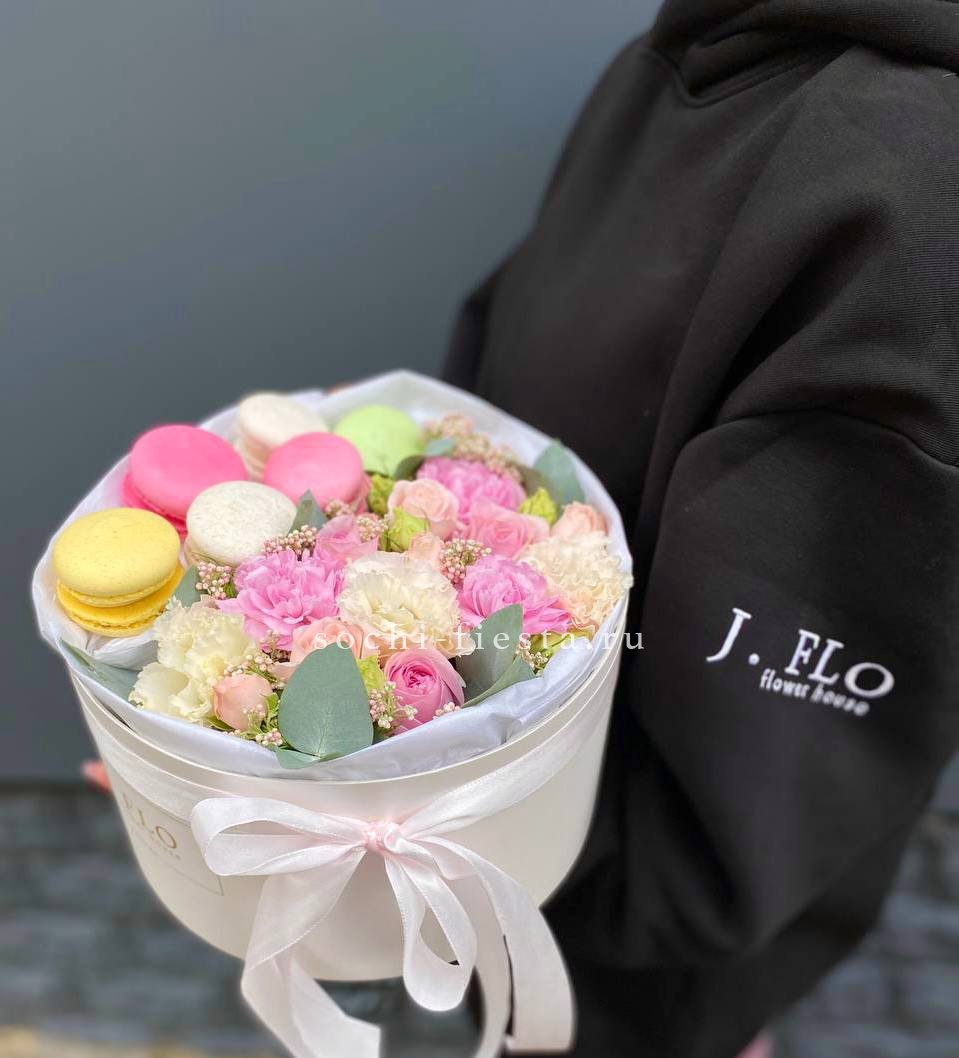 Пудровые розы и кустовые соцветия собраны с диантусами и озотамнусом в округлую форму. Шесть макаронс завершают композицию и создают ощущение домашнего уюта.