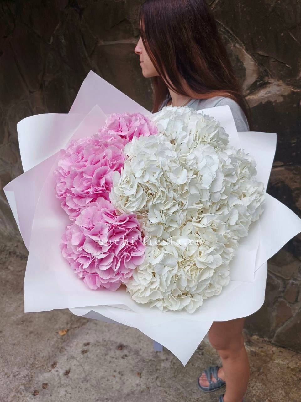 гортензия (розовая, белая) - 7 шт., лента, дизайнерская упаковка.
