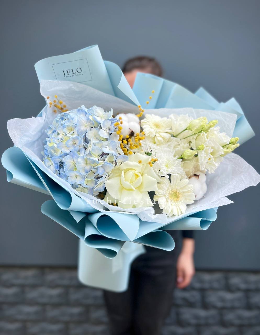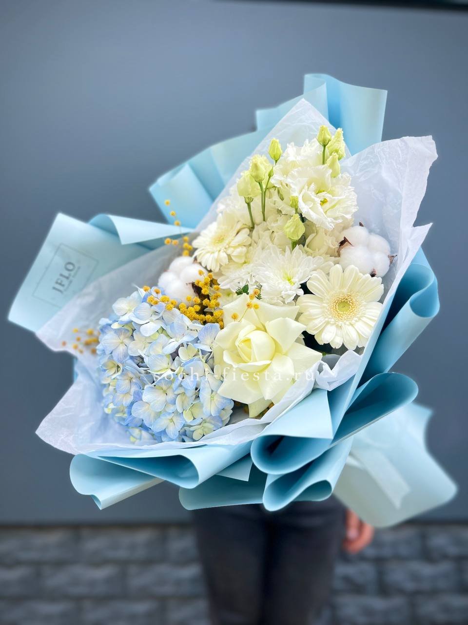 гортензия, белые розы, гипсофилы (или мимоза), эустомы, герберы, хлопок, лента и дизайнерская пленка.