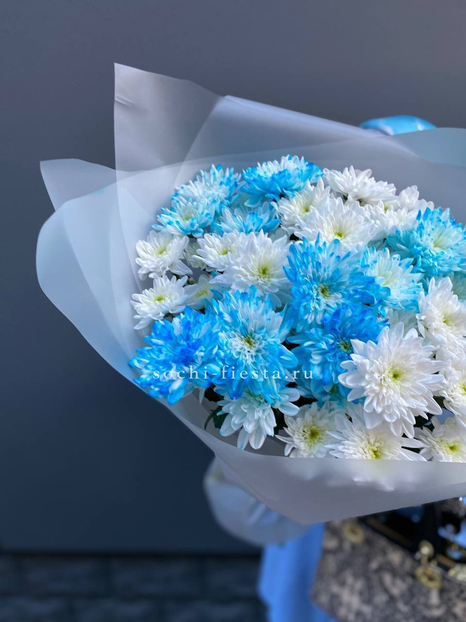 Одиннадцать кустовых хризантем окрашены в холодный голубой оттенок и собраны в плотную композицию. Каждая ветка раскрывается множеством бутонов, создавая объёмную шапку цвета зимнего неба.