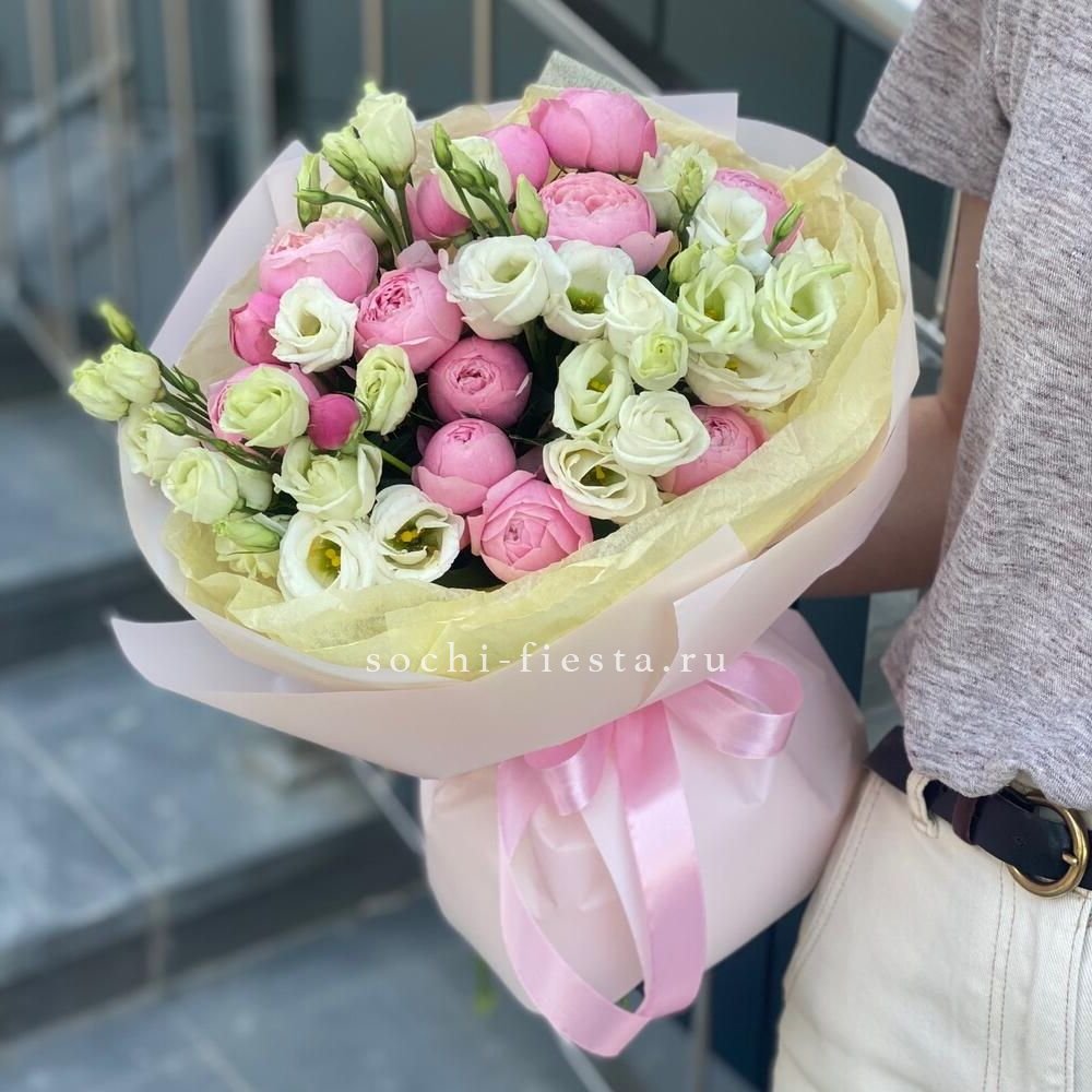 пионовидные розы Бомбастик, эустома, оформление.