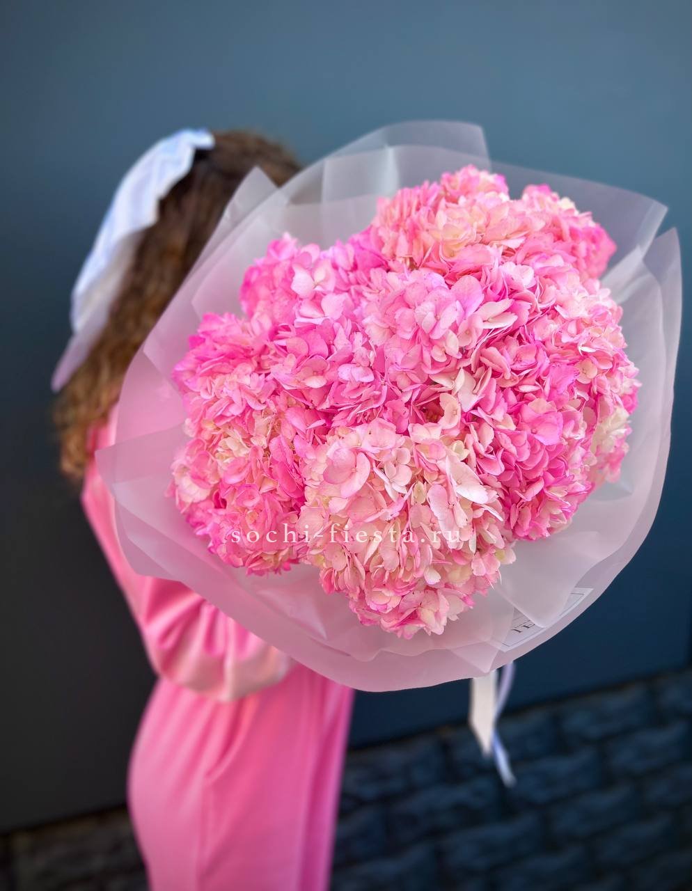 эустома, розовые пионы Сара Бернар, гортензия, розы одноголовые, эвкалипт, лента, дизайнерская упаковка.