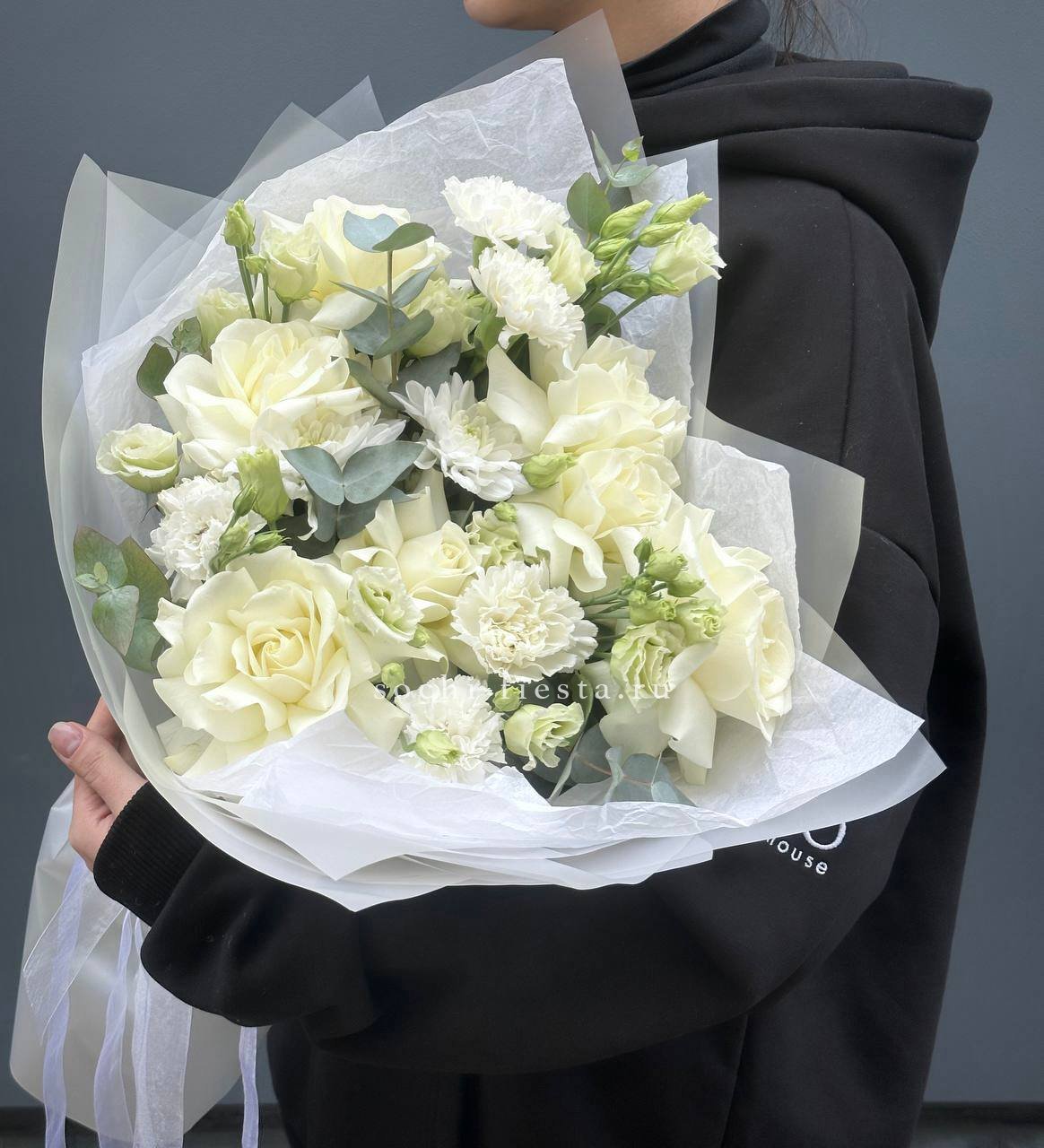 Белые розы и эустома раскрываются полными бутонами среди мелких соцветий диантуса и хризантем. Свежая зелень эвкалипта добавляет композиции глубину и завершённость.
