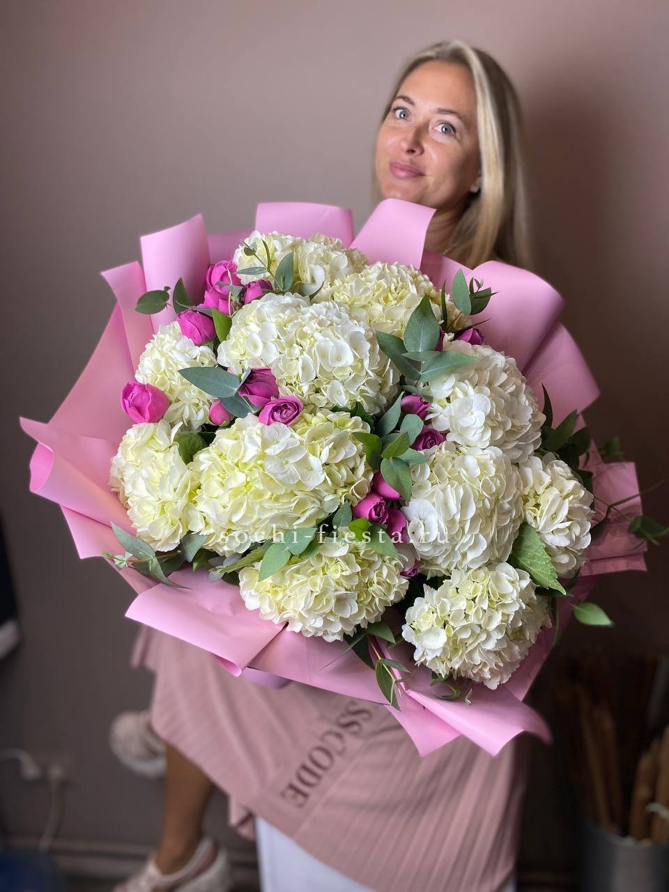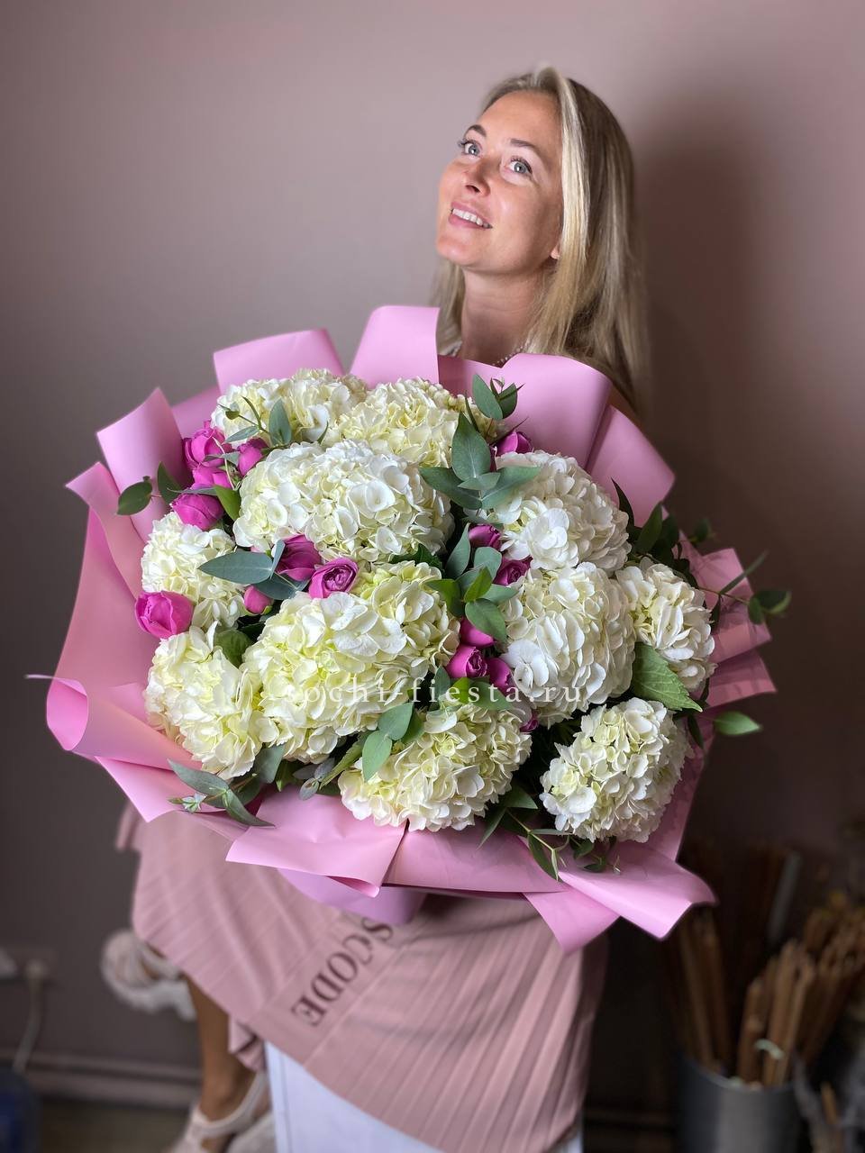 гортензия - 11 шт., пионовидная кустовая роза Мисти Баблс 7 шт., лента, дизайнерская упаковка.