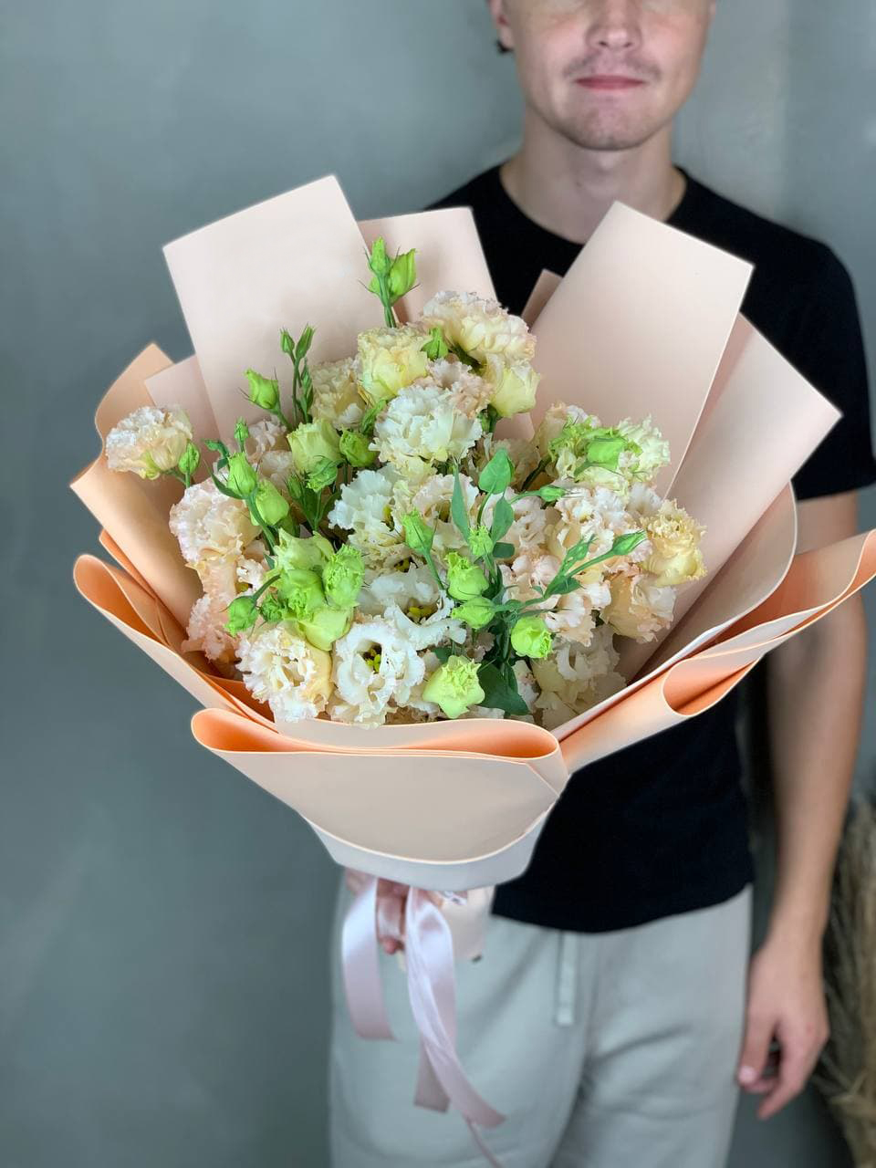 Пять веточек эустомы дополнены эвкалиптом и собраны в компактную композицию. Серебристая зелень добавляет глубину и свежесть между пышными бутонами. Лаконичный букет с продуманной структурой.