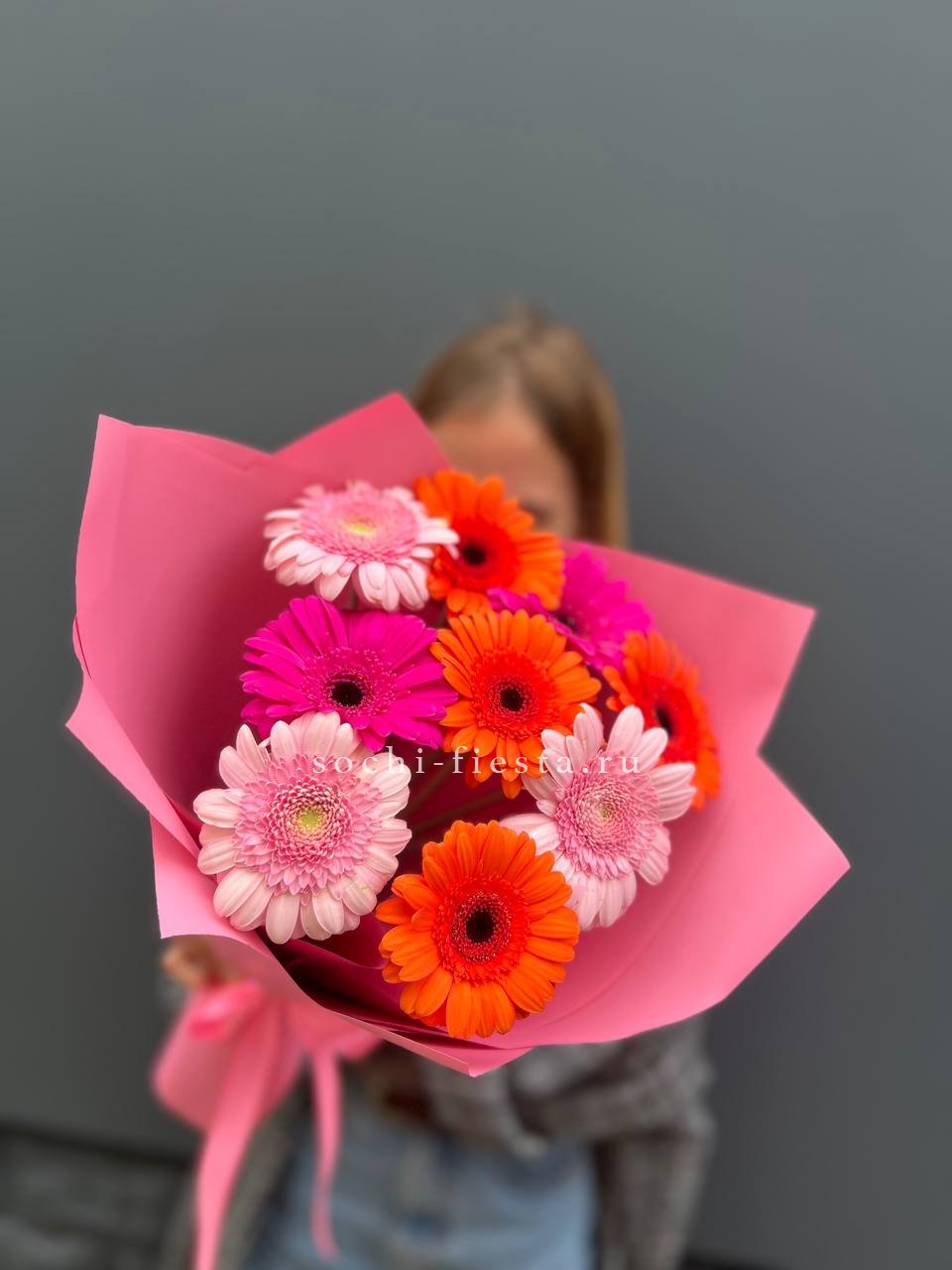 Девять гербер разных оттенков образуют компактный букет с чёткими линиями. Лаконичная упаковка позволяет каждому цветку звучать самостоятельно, создавая весёлую радужную композицию.