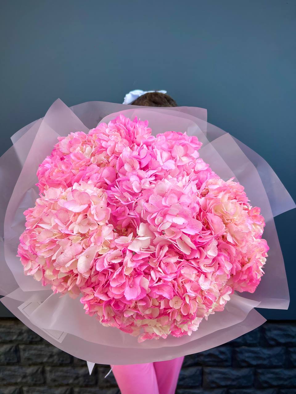 Одиннадцать соцветий гортензии собраны в объемную композицию с естественной воздушностью. Каждая головка раскрывается множеством мелких лепестков, создавая плотное цветовое облако.