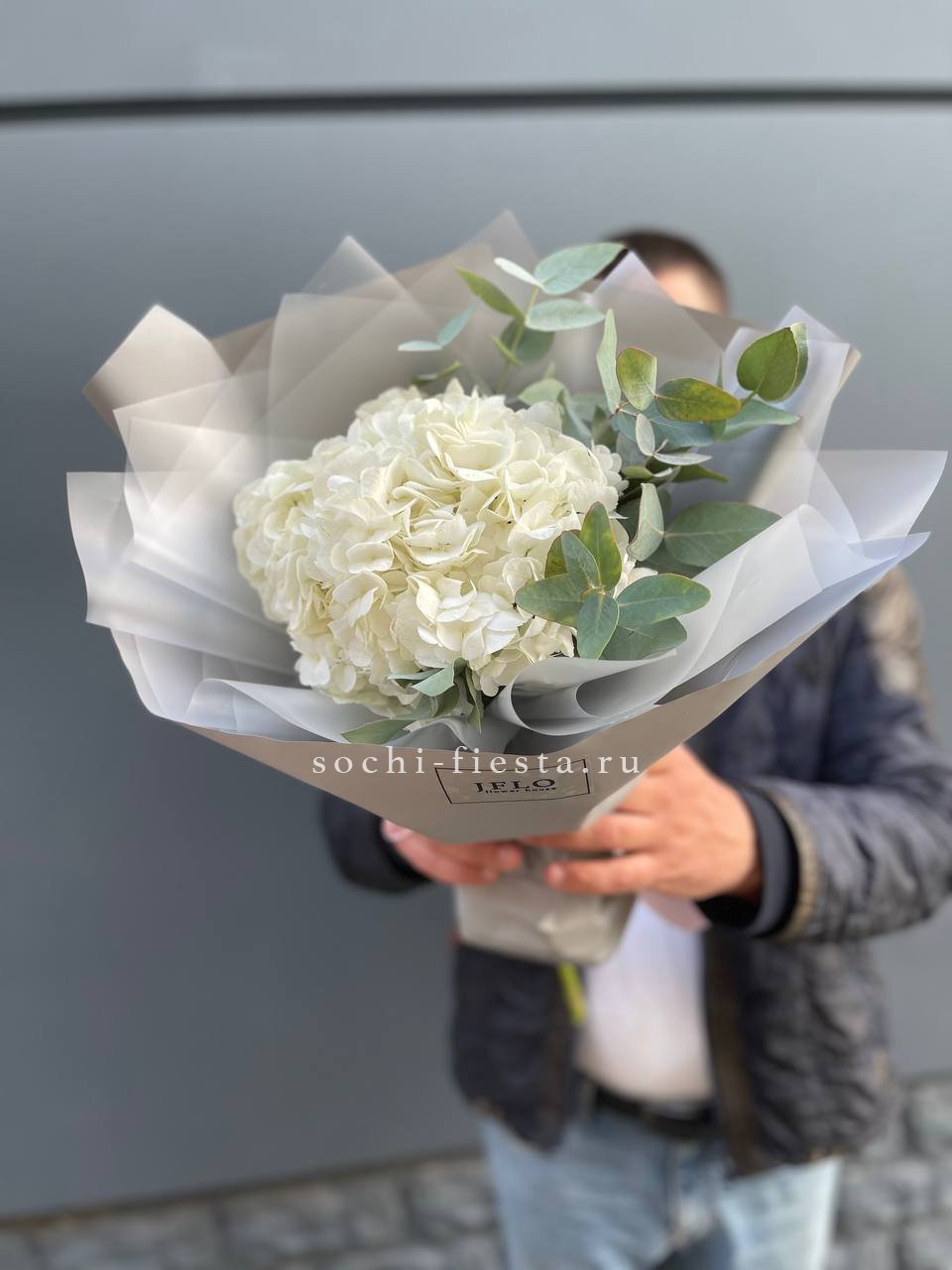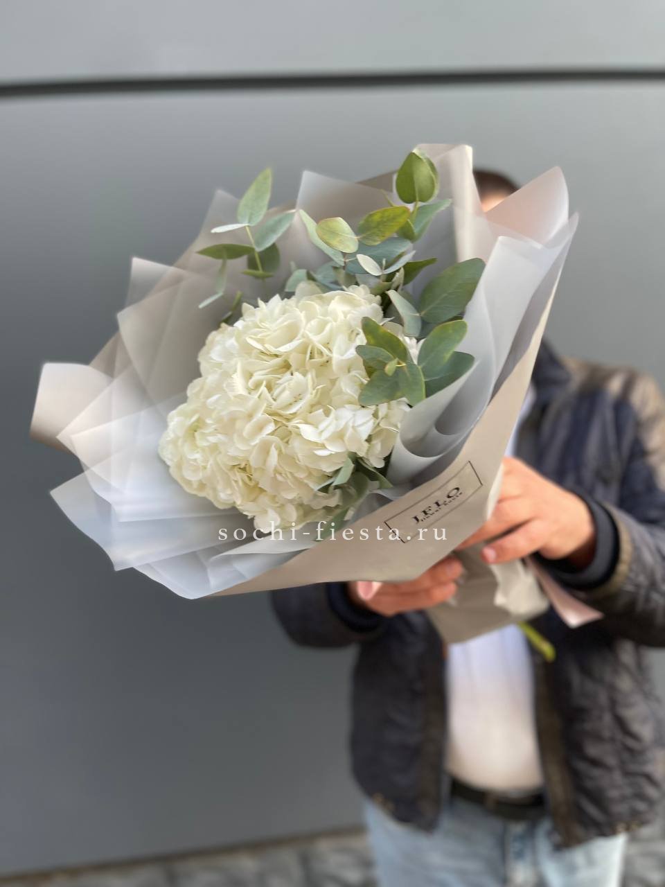 Белоснежные соцветия гортензии дополнены матовой зеленью эвкалипта, которая задаёт букету спокойный природный ритм. Композиция выглядит свободно и естественно, сохраняя графичность линий.
