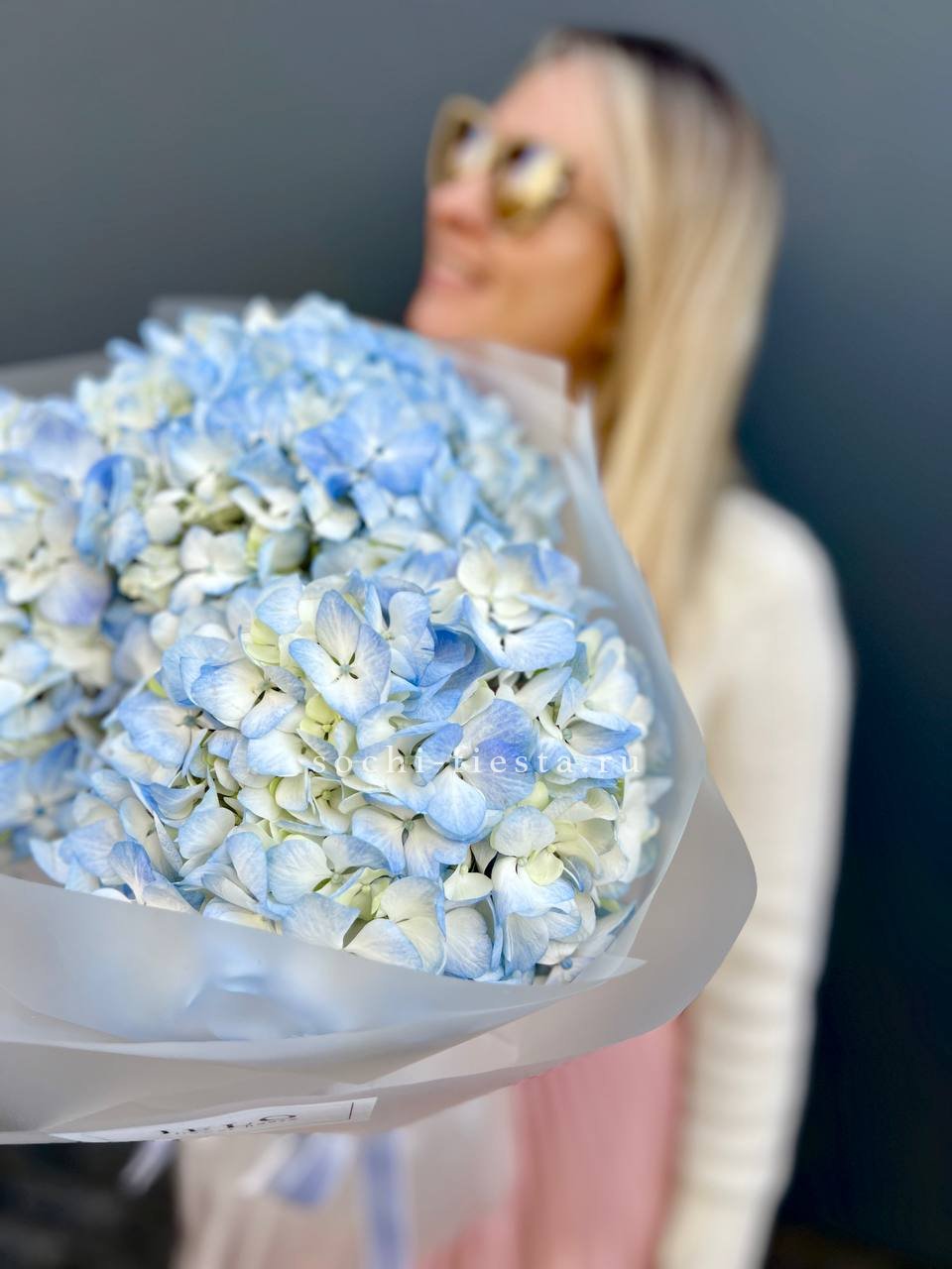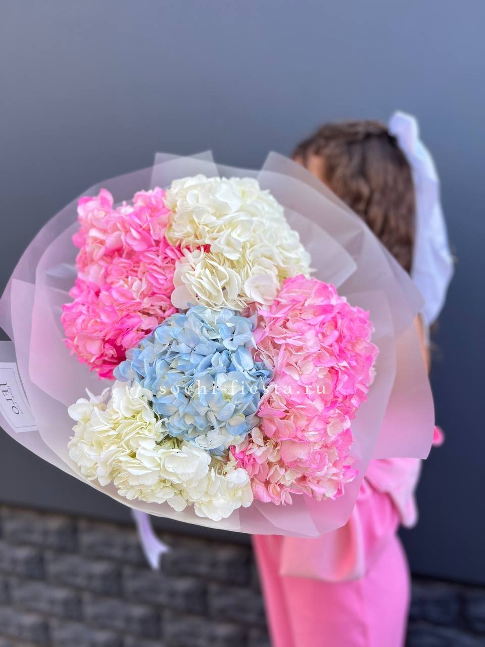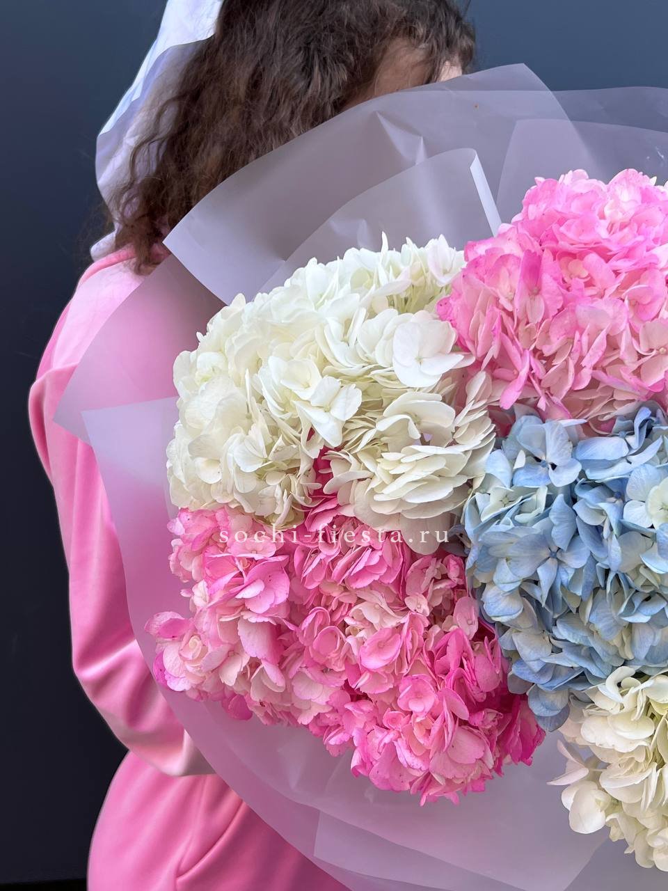 Пять соцветий гортензии в оригинальной упаковке-пиджачке. Необычная форма подачи превращает классический монобукет в яркий акцент для торжественного момента.