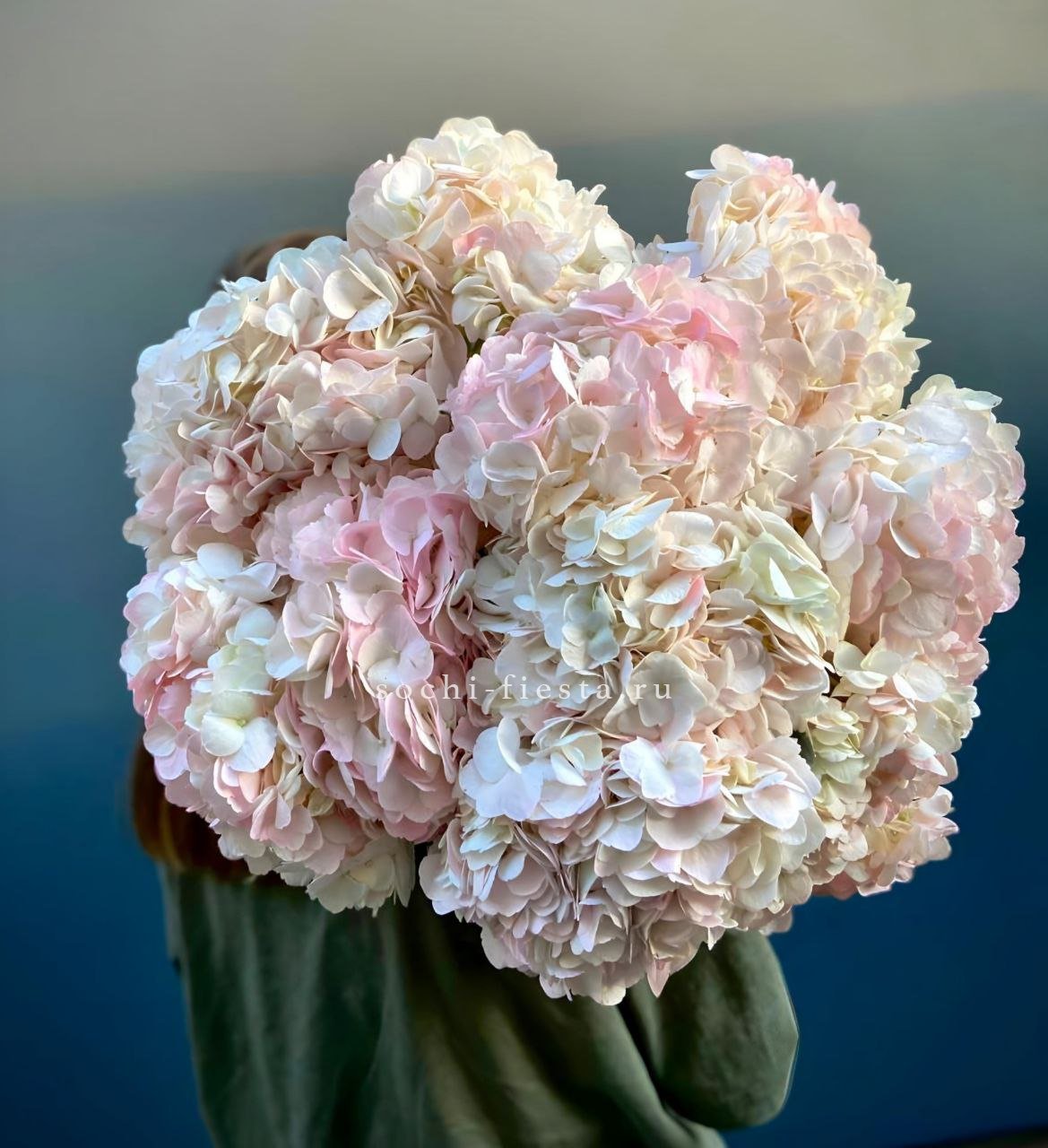 Пышные шапки розовой гортензии собраны в объёмную охапку, где каждое соцветие создаёт мягкую фактурную волну. Оттенок варьируется от пудрового до насыщенного ягодного, формируя живописную глубину.
