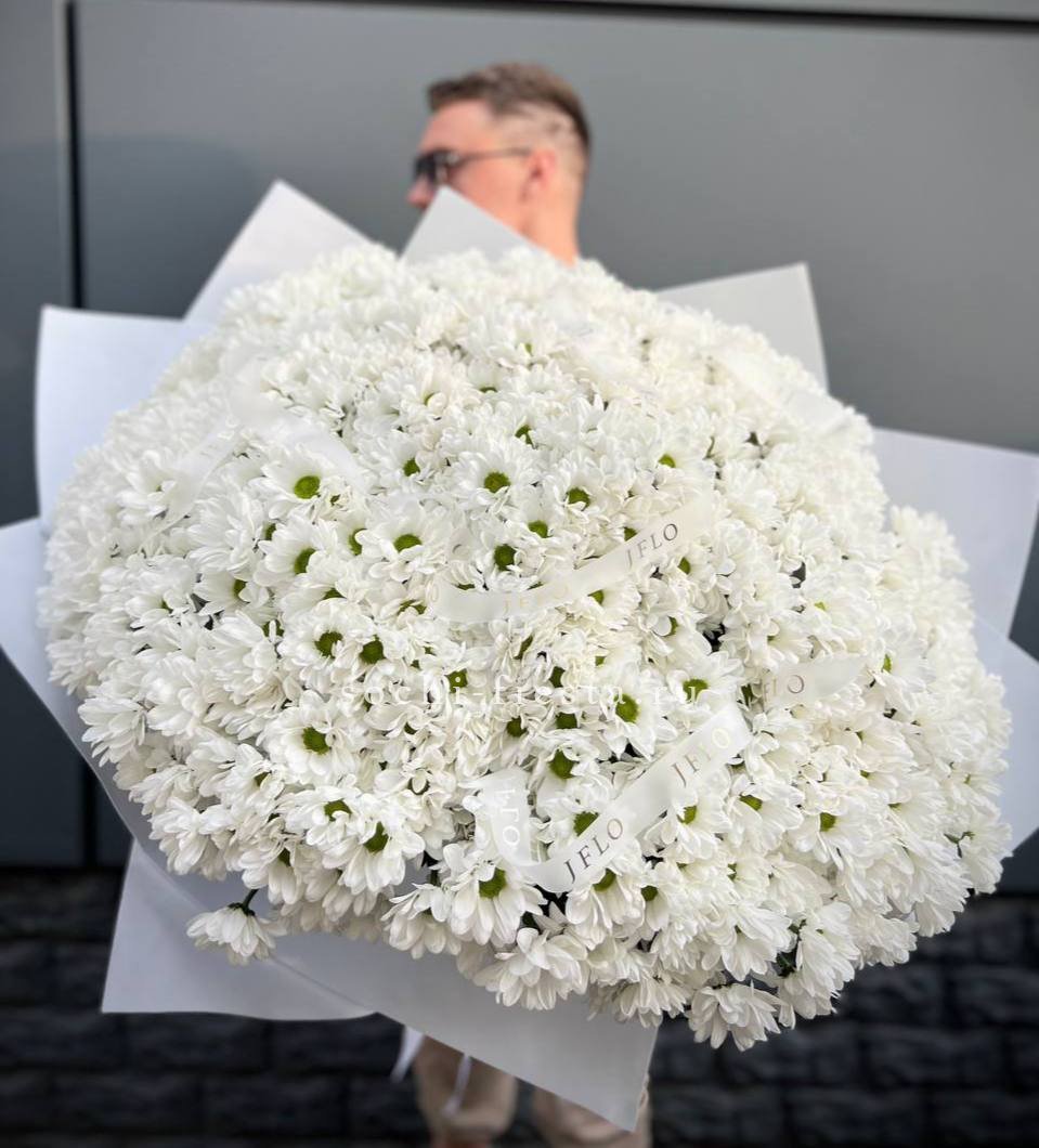 Девять кустовых хризантем сплетаются с пушистыми колосками лагуруса в воздушную композицию. Мягкие текстуры и природная простота создают ощущение прогулки по летнему полю.