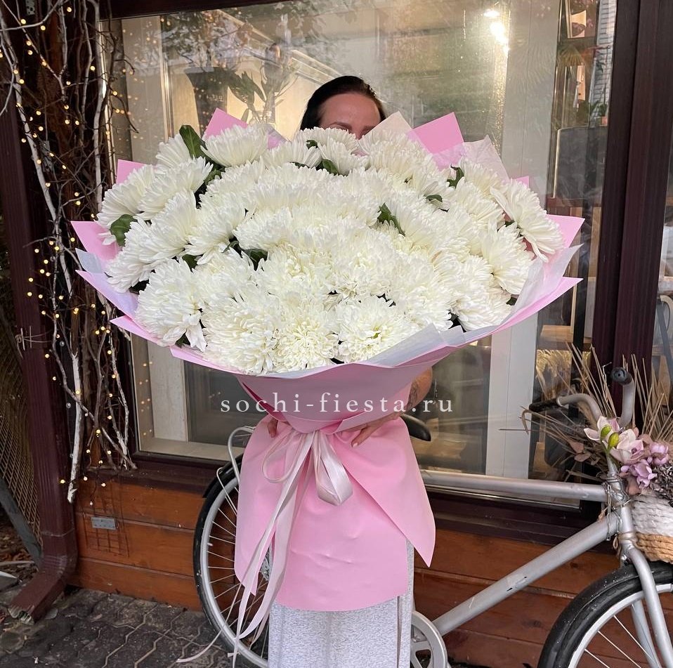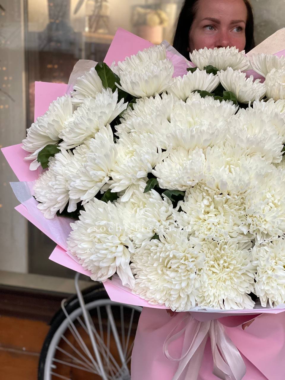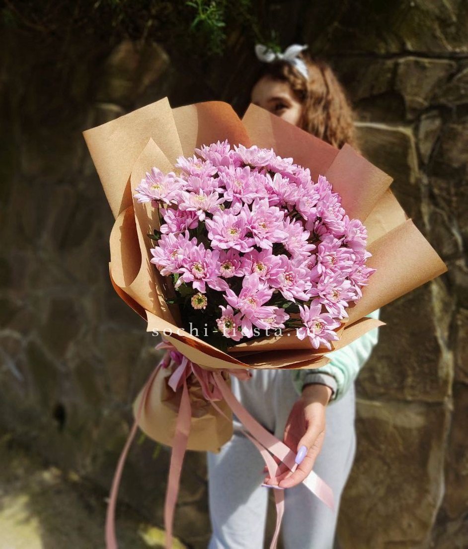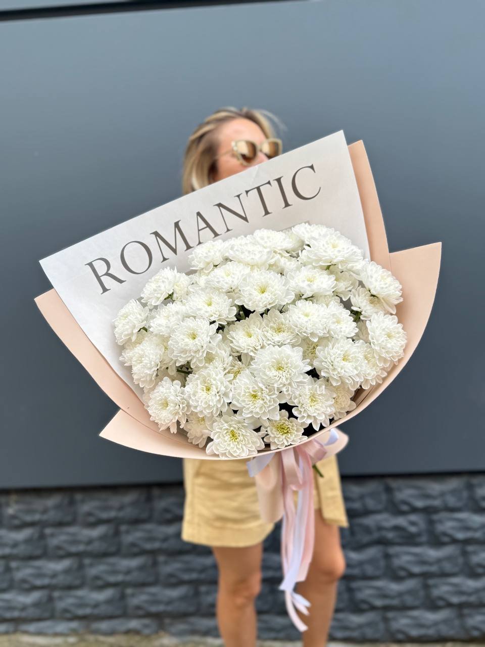 Девять хризантем Бигуди с игольчатыми лепестками необычной формы. Каждый бутон напоминает фактурный шар с закрученными концами, создавая эффектную текстуру и живую динамику.
