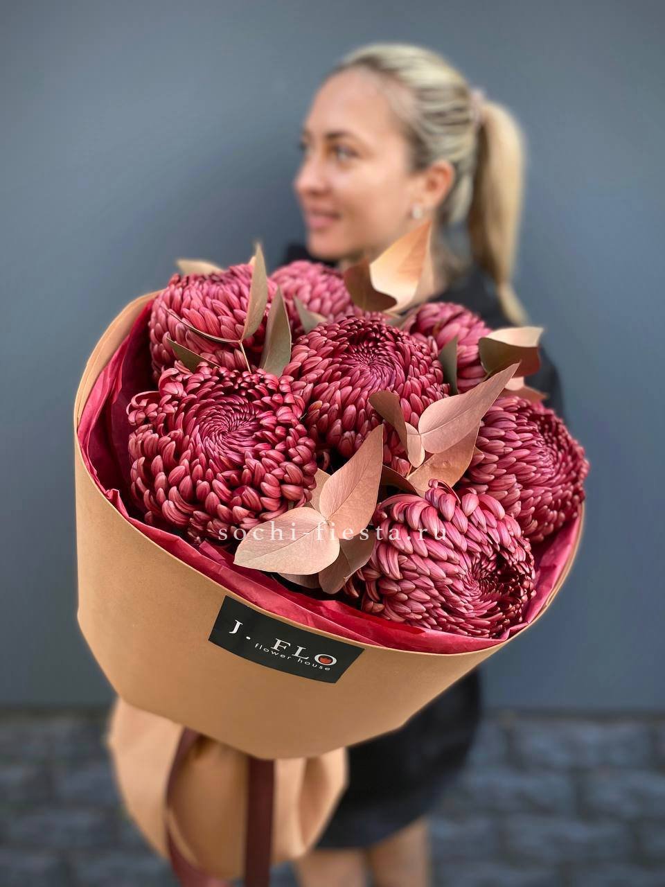 хризантемы - 7 шт, эвкалипт,  лента, дизайнерская упаковка.