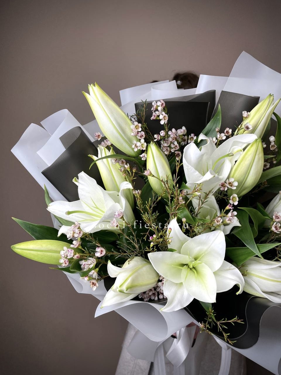 5 лилий, хамелациум или гипсофила, лента, упаковка, лента.