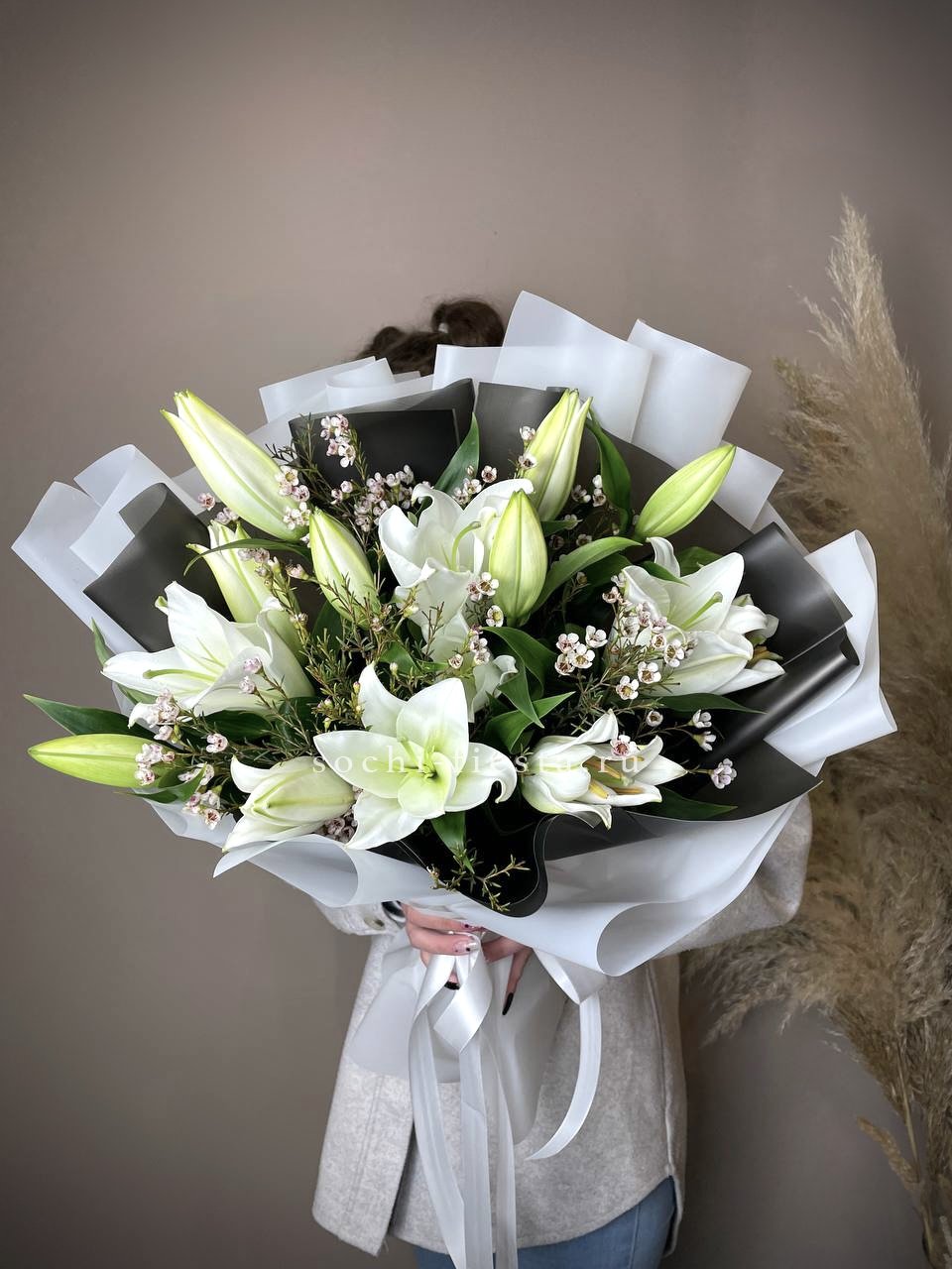 Белые лилии в обрамлении воздушных соцветий образуют светлую композицию с мягким силуэтом. Хамелациум или гипсофила добавляют объём без утяжеления. Букет выглядит чисто и свободно.