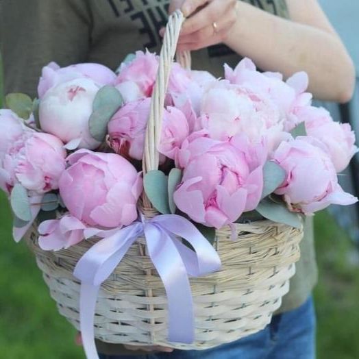 15 пионов, эвкалипт, корзина, лента.