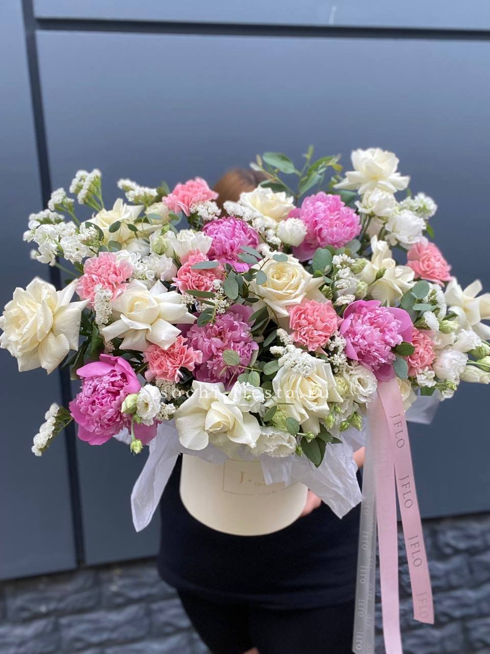 Пятнадцать пионов с пышными бутонами образуют объёмную композицию в воздушной упаковке. Каждый цветок раскрывается слоями, создавая ощущение лёгкости и наполненности одновременно.