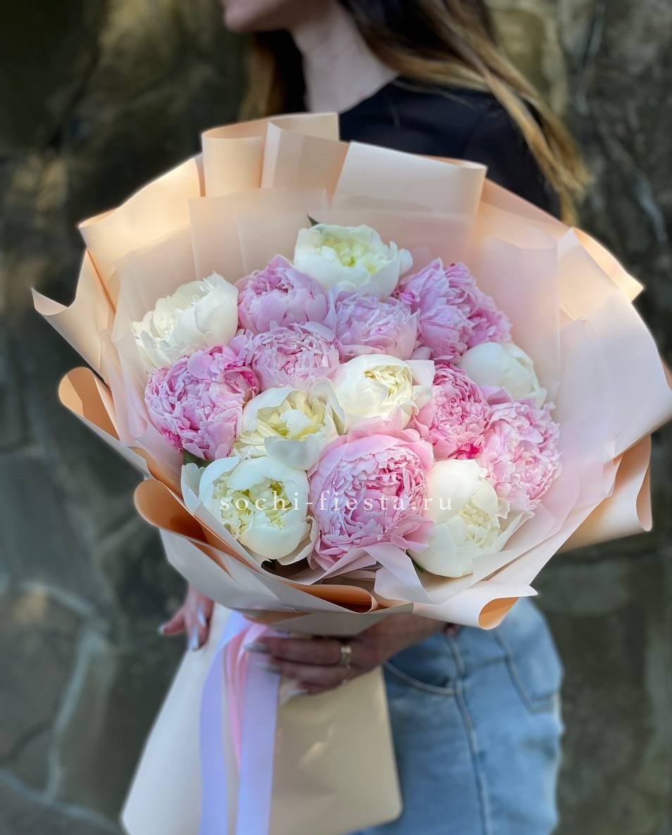 15 пионов, лента, дизайнерская упаковка.