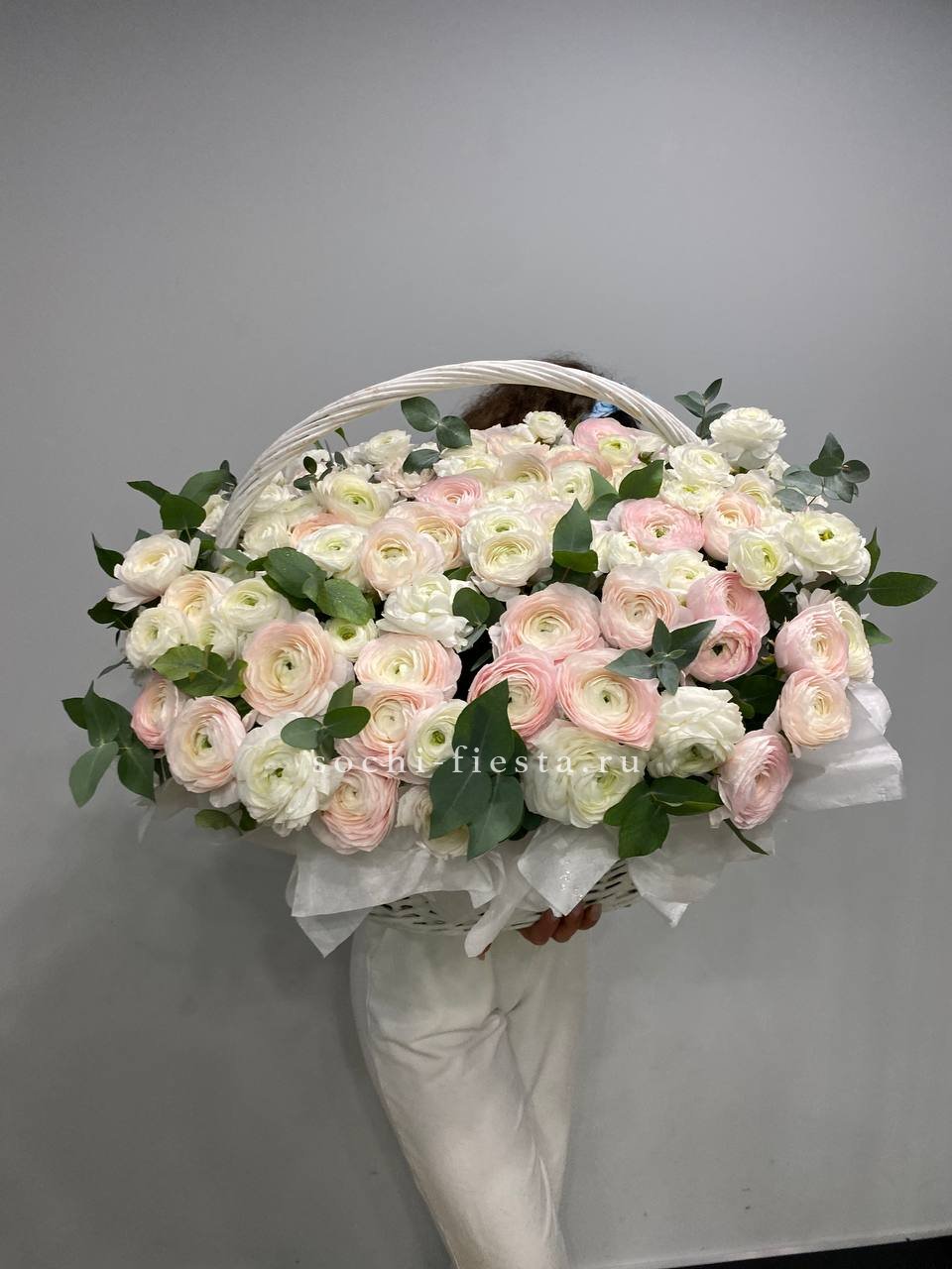 Пятнадцать розовых ранункулюсов раскрываются пышными головками с множеством лепестков. Монобукет выглядит объёмно и заполняет пространство живым цветом.