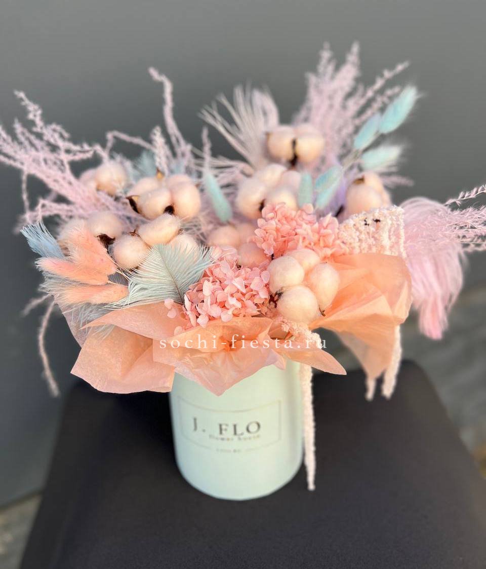 Бокс с природными текстурами: мягкость хлопка, воздушность лагуруса и графичность амаранта. Перья добавляют легкости. Композиция держит форму и не теряет выразительности со временем.