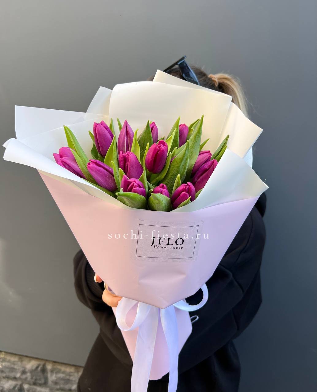 15 пурпурных тюльпанов, лента, оформление.