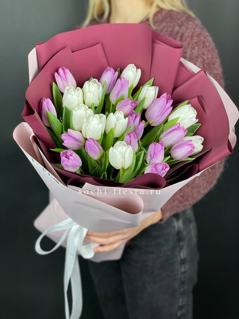 Двадцать пять разноцветных тюльпанов в комбинированном оформлении создают жизнерадостное настроение. Микс оттенков от желтого до фиолетового образует компактную композицию с яркими акцентами.