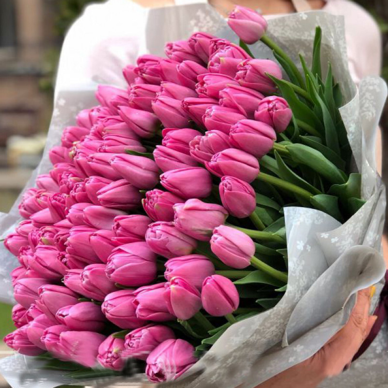 Сто один розовый тюльпан образует пышное облако нежных оттенков от пудры до коралла. Объемная композиция притягивает взгляд игрой тонов и создает весеннее настроение в любом помещении.