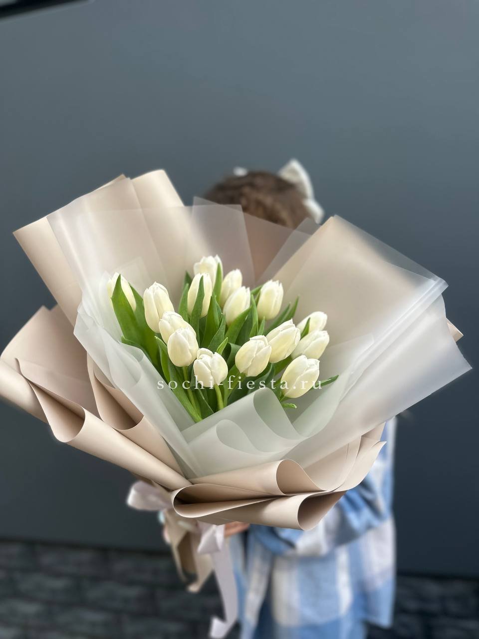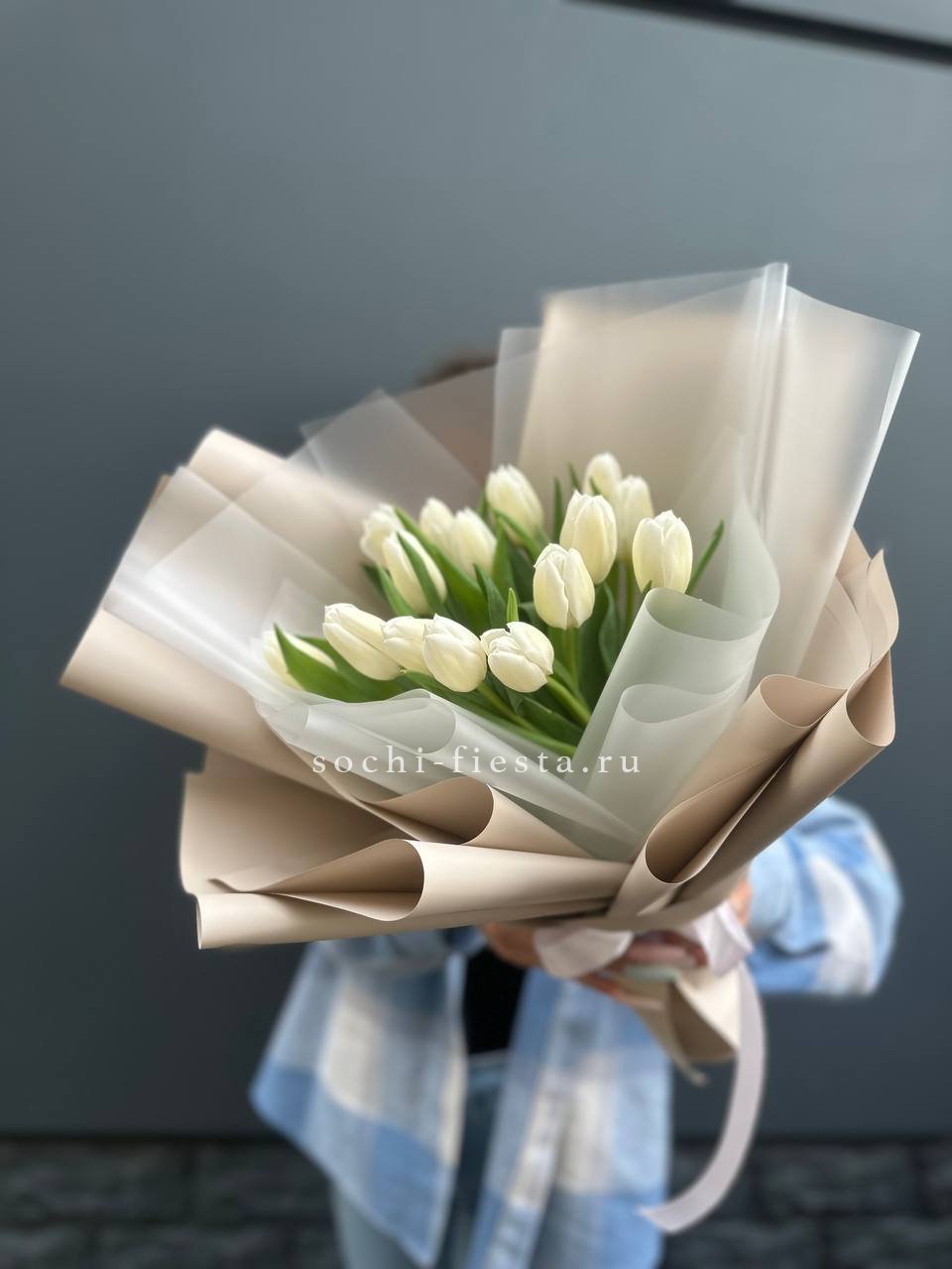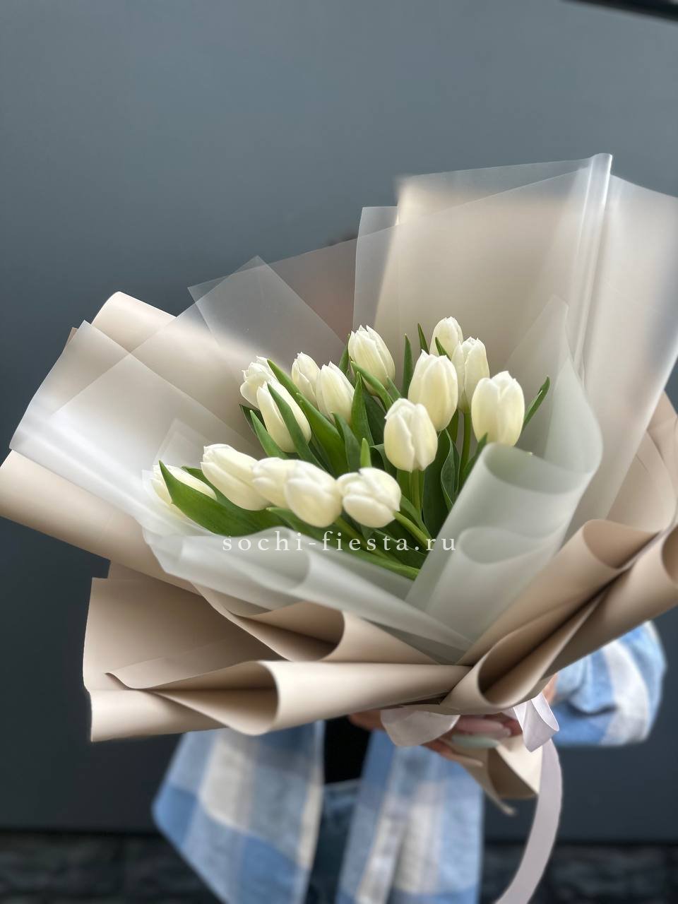 Пятнадцать белоснежных бутонов в лаконичной упаковке держат форму и сохраняют свежесть надолго. Тюльпаны раскрываются постепенно, их лепестки плотные и аккуратные. Композиция удобна для размещения в любой вазе.