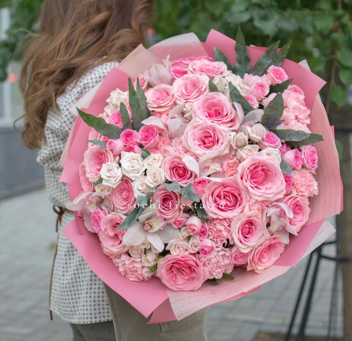 Пышные шапки гортензии переплетаются с бархатными бутонами пионовидных роз, создавая объёмную композицию насыщенного розового оттенка. Орхидеи и эустома добавляют воздушности, а диантус расставляет яркие точки. Букет заполняет пространство и притягивает взгляд своей плотной структурой.
