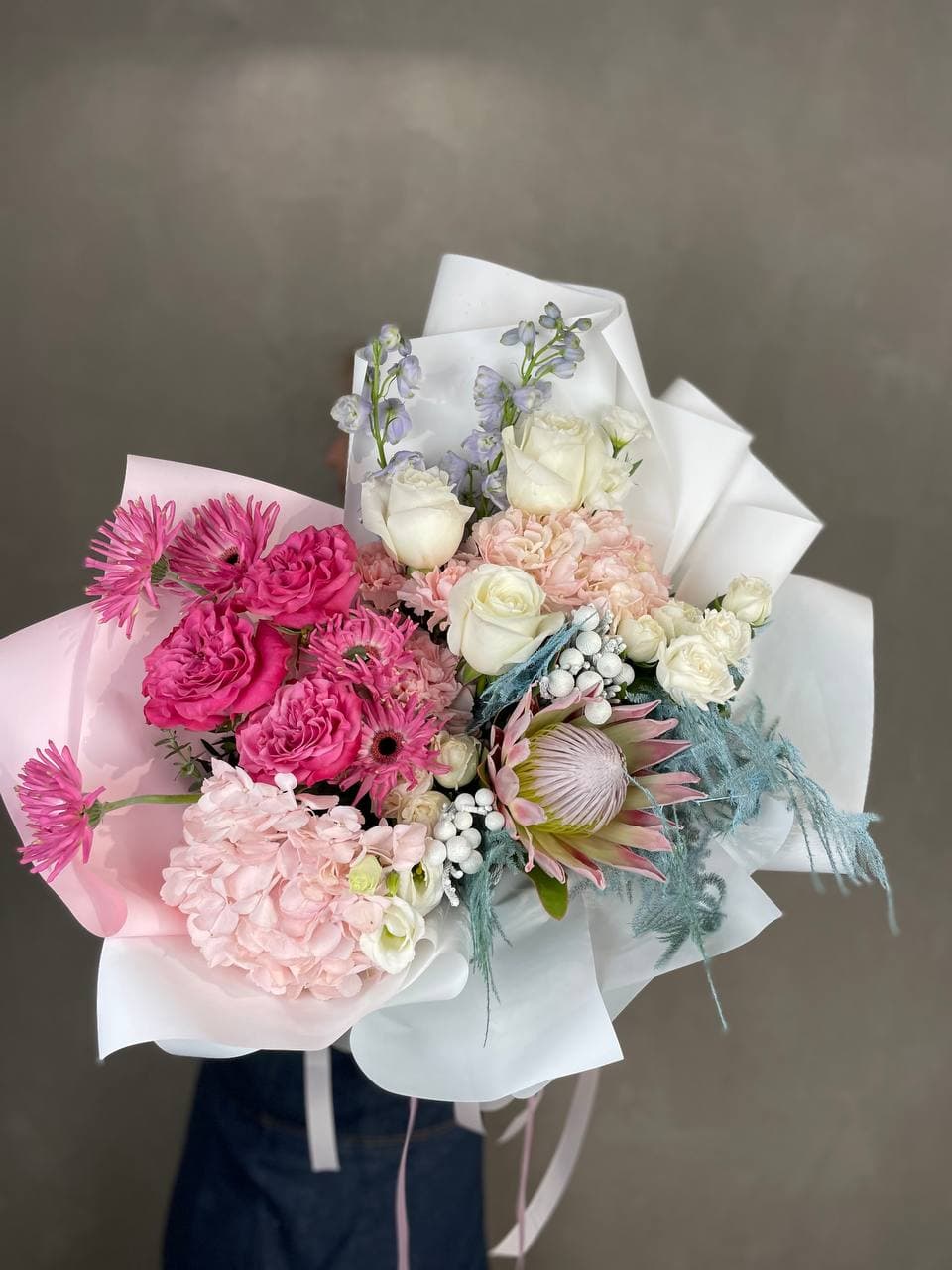 Протея задаёт графику, гортензия заполняет объём, а кустовые розы рассыпаются между крупными соцветиями. Аспарагус создаёт воздушную раму, бруния добавляет текстурные точки. Букет с продуманной архитектурой и смелым растительным миксом.
