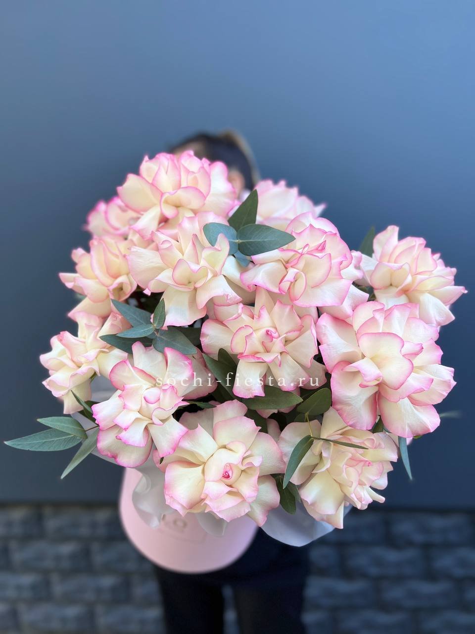 гортензия, кустовые розы, эвкалипт, ваксфлауэр (или аналог), лента, цилиндр D20.