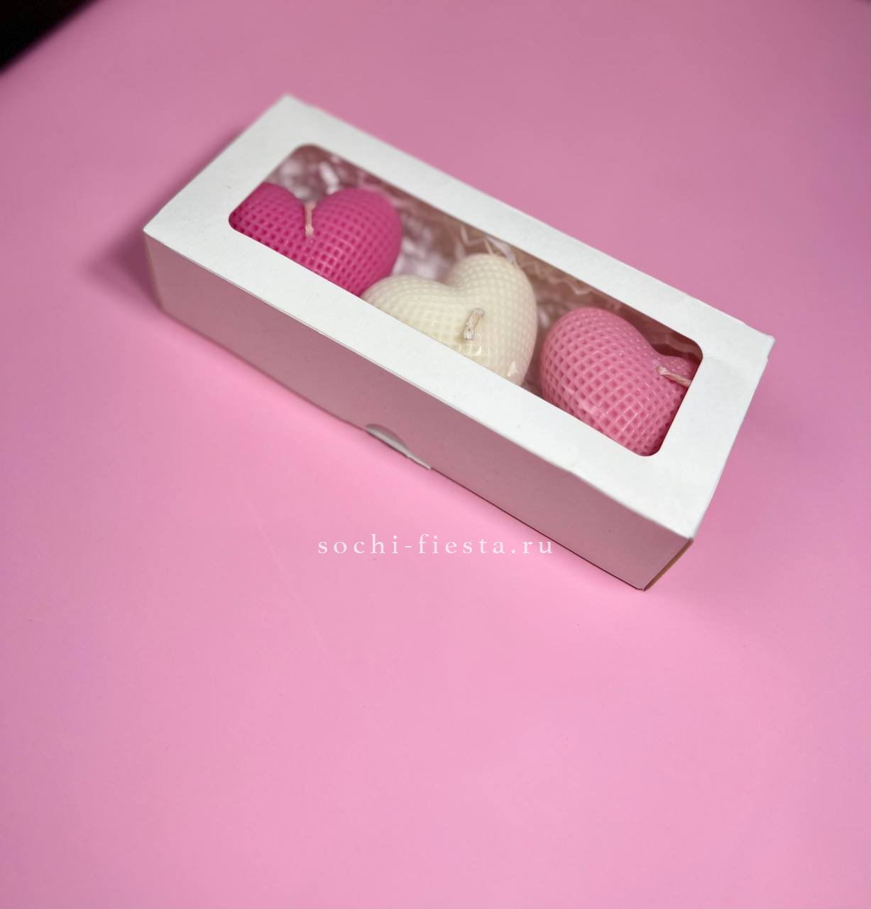 свечи ручной работы, 3 сердца в виде плюшевых сердец. Подарок является дополнением к цветочной композиции.