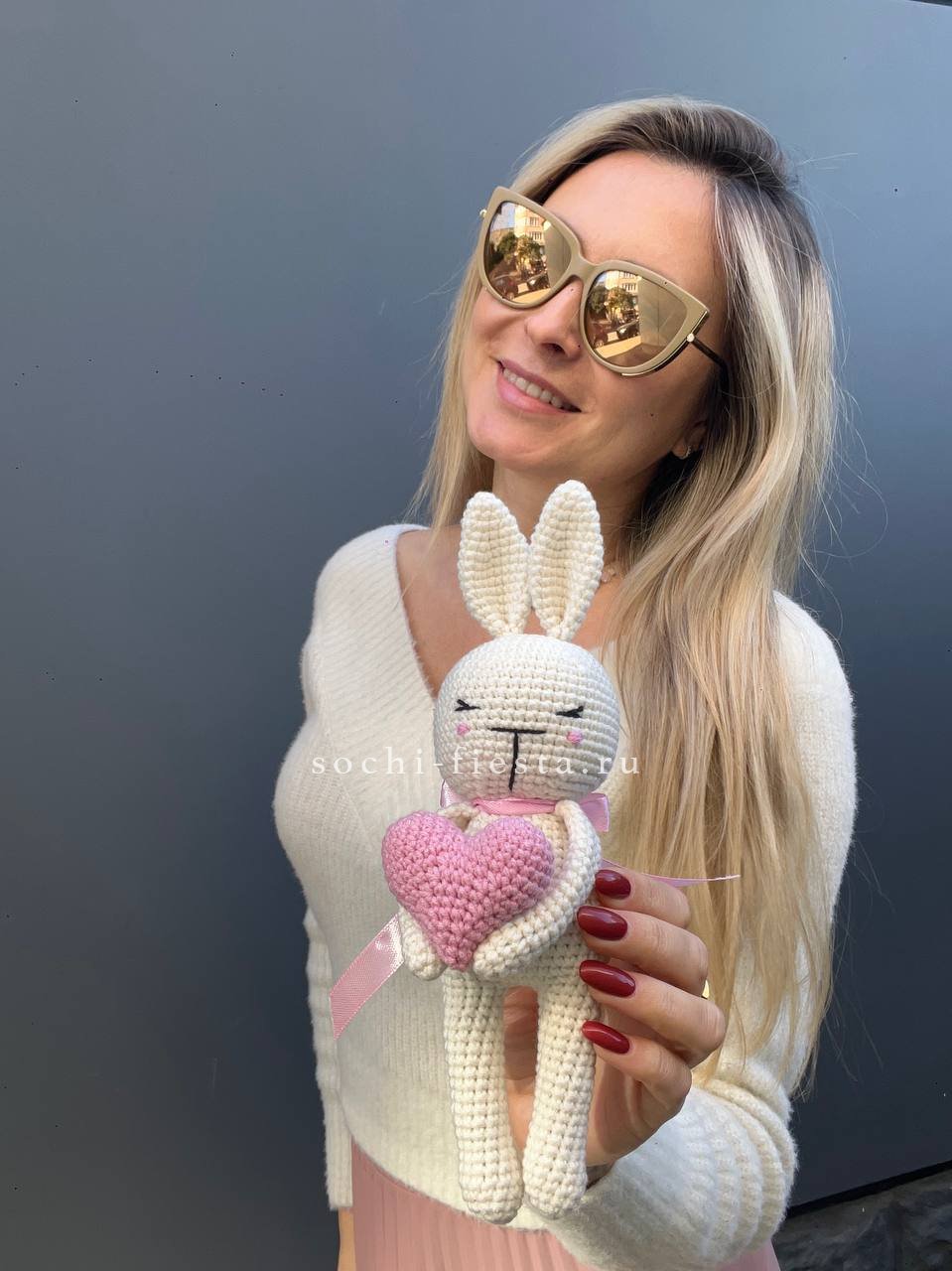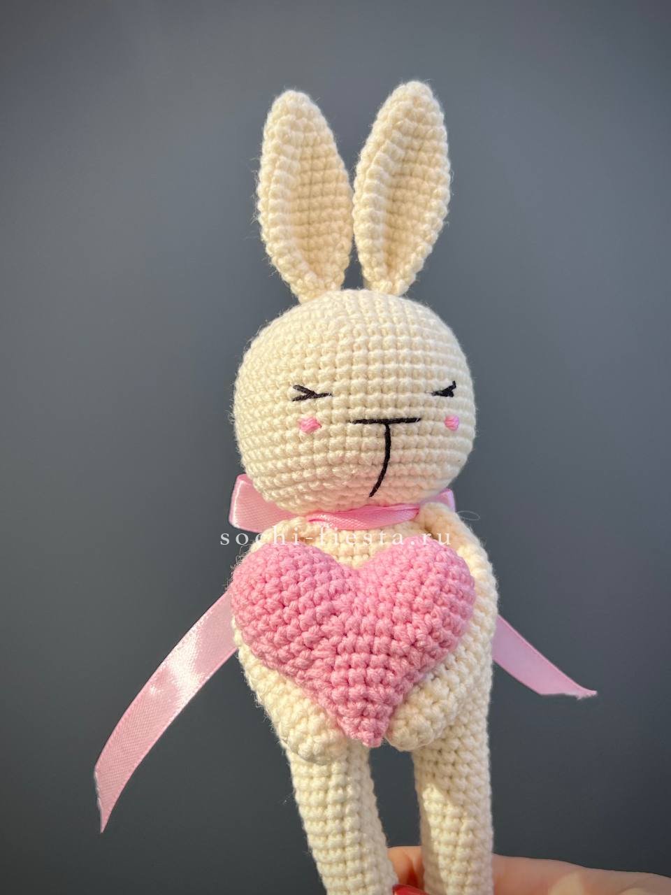 Зайка держит красное сердце в лапках — готовый жест без лишних слов. Фактура плетения мягкая и объёмная. Трогательный акцент рядом с живыми цветами