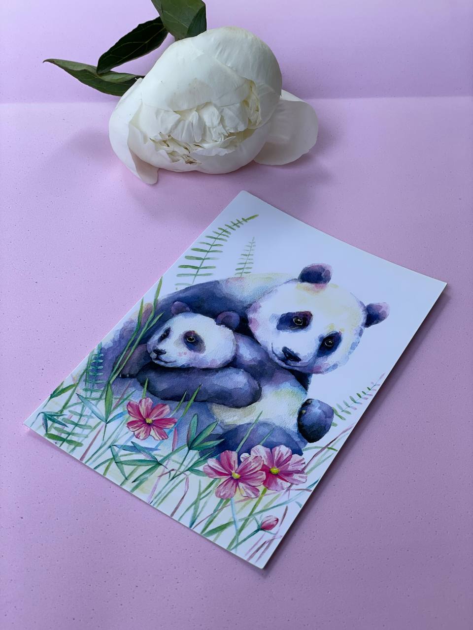 Милая панда обнимает бамбук на лицевой стороне карточки. Внутри поместится ваше послание из нескольких фраз, а чёрно-белая графика добавит теплоты.