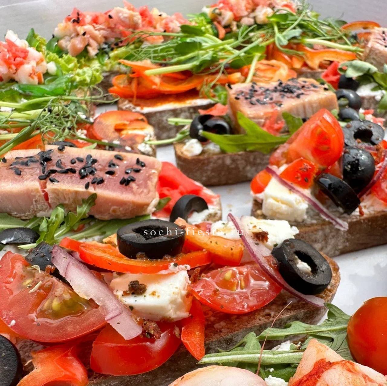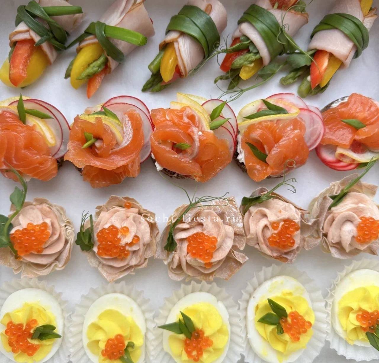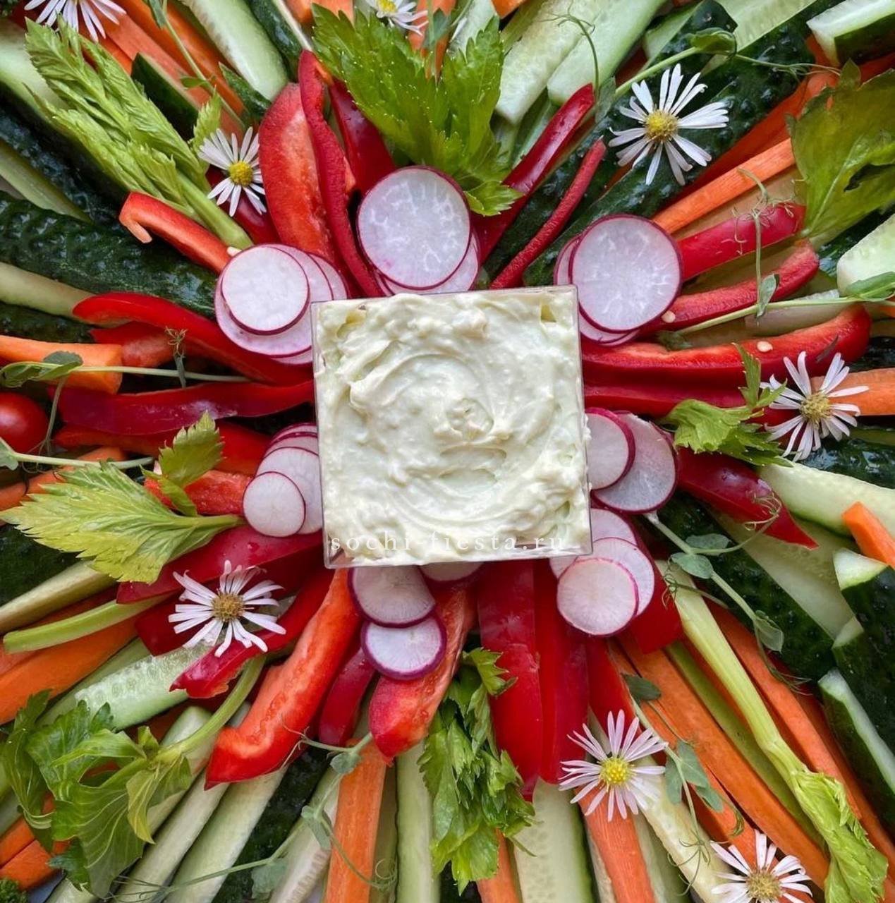 сезонные овощи с муссом из кальмара и авокадо. Щедро уложены в несколько слоев. Вес 2-2,5 кг. Бокс рассчитан на 8-10 персон.