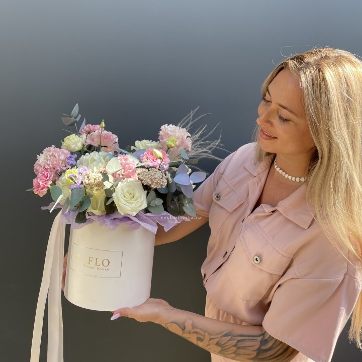Шляпная коробка в студии Химкие — практичный формат подарка для офиса, семейного юбилея, свадьбы. Композиция с флористической губкой, не требующая вазы, готовая к дарению сразу после получения. Это удобно и для отправителя, и для адресата.