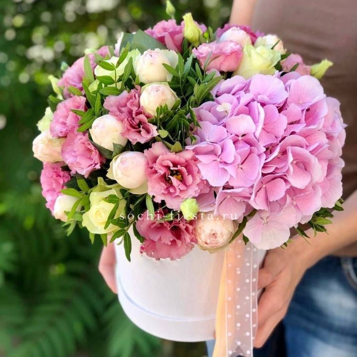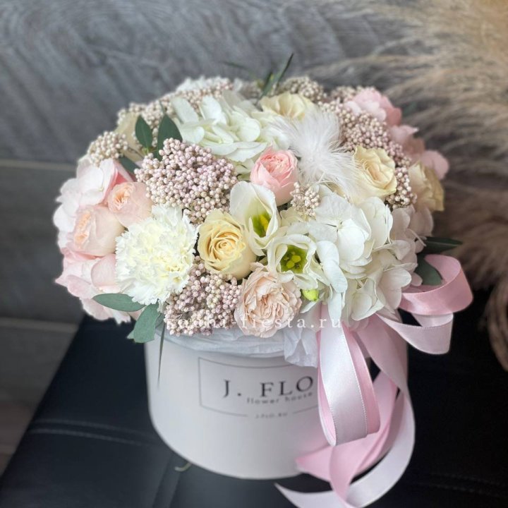 Шляпная коробка в студии Химкие — практичный формат подарка для офиса, семейного юбилея, свадьбы. Композиция с флористической губкой, не требующая вазы, готовая к дарению сразу после получения. Это удобно и для отправителя, и для адресата.