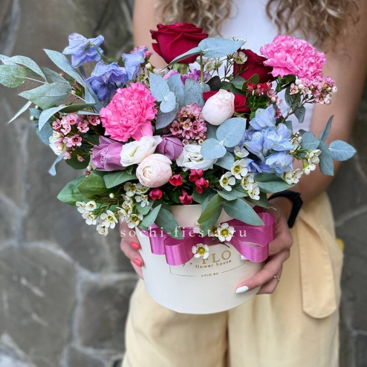 Шляпная коробка в студии Химкие — практичный формат подарка для офиса, семейного юбилея, свадьбы. Композиция с флористической губкой, не требующая вазы, готовая к дарению сразу после получения. Это удобно и для отправителя, и для адресата.