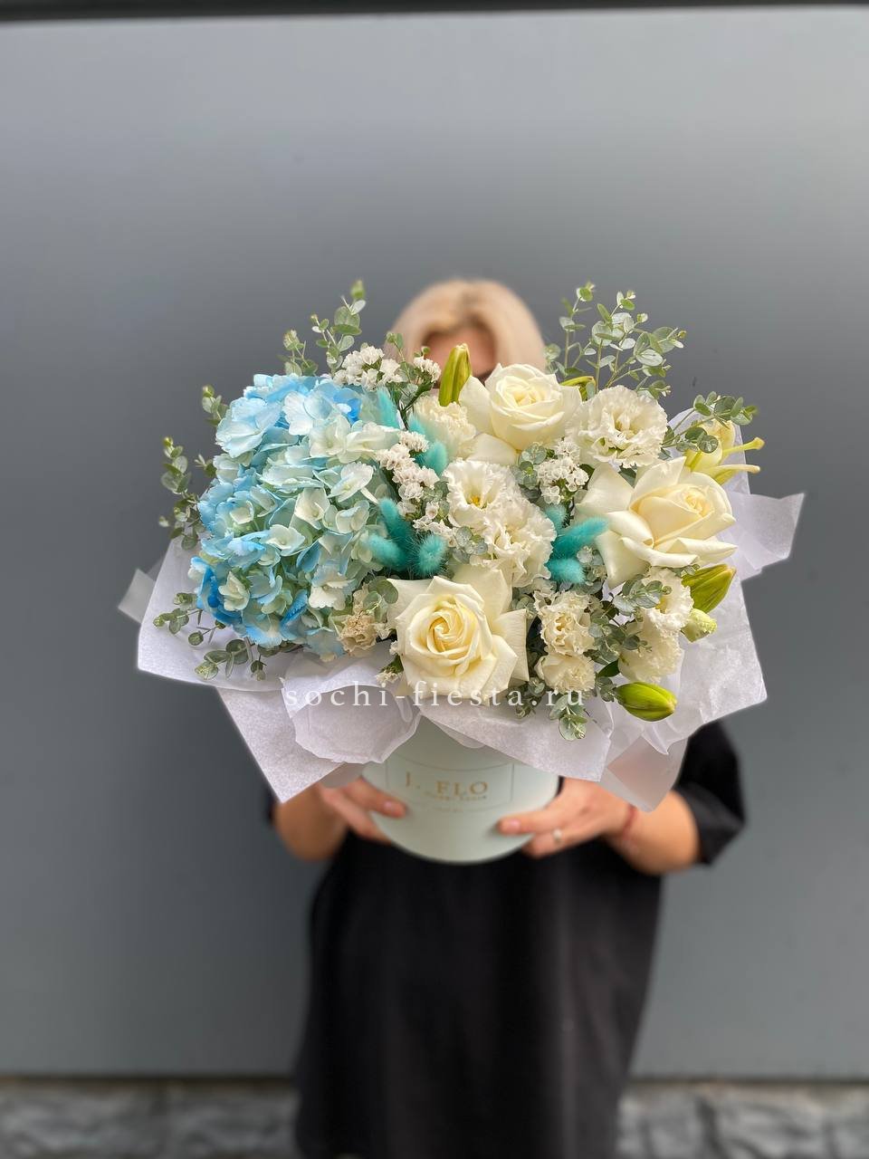 Голубая гортензия задает спокойный тон всей композиции, где статица и лагурус добавляют воздушности. Розы и лилии дополняют образ свежими акцентами без лишней пышности.