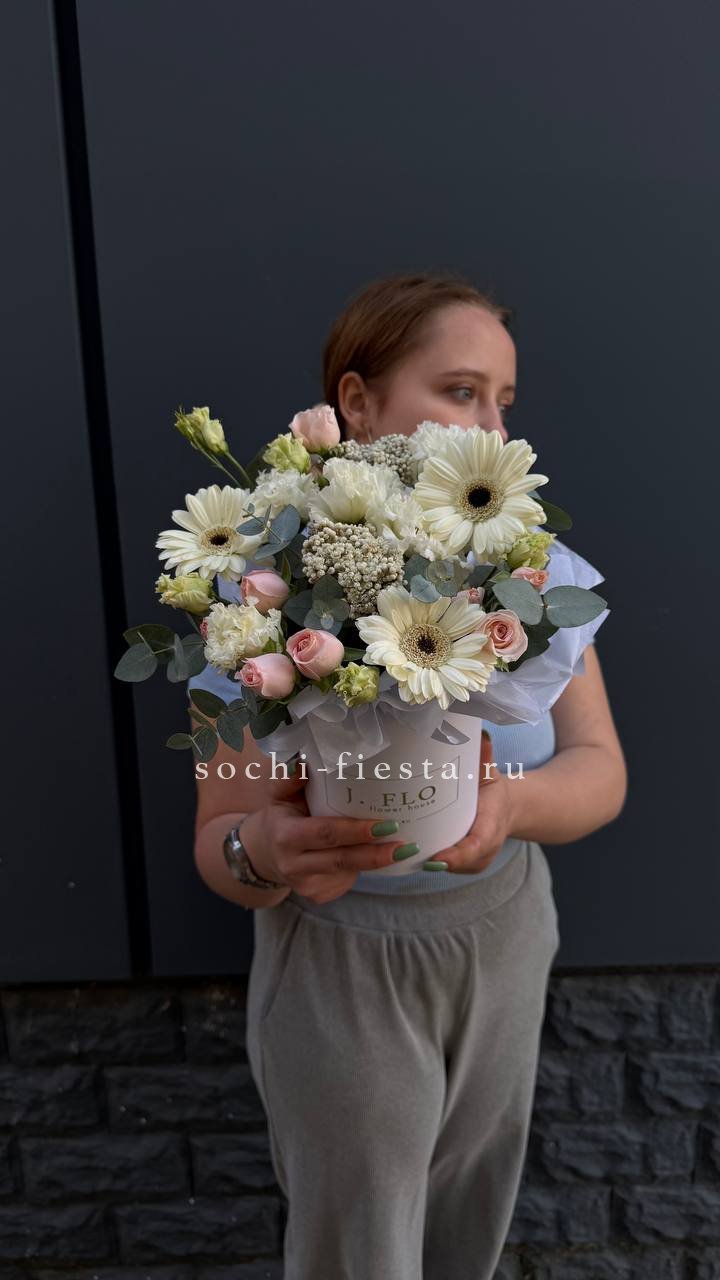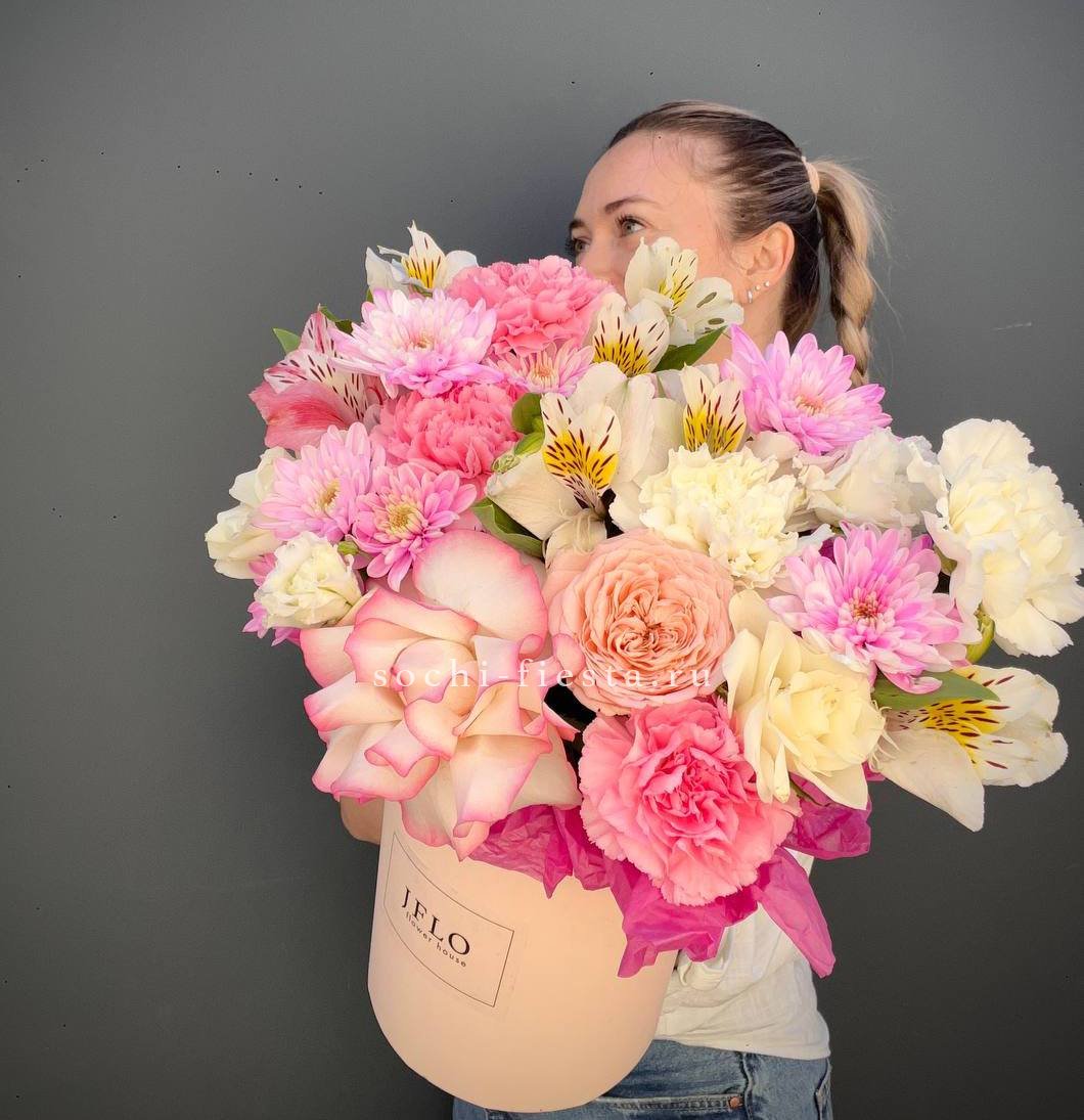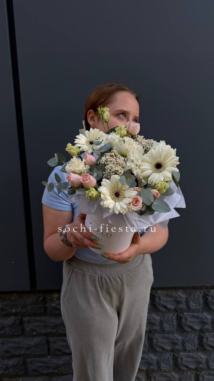 розы, альстромерии, хризантемы, диантусы, цилиндр D13,оазис, тишью.