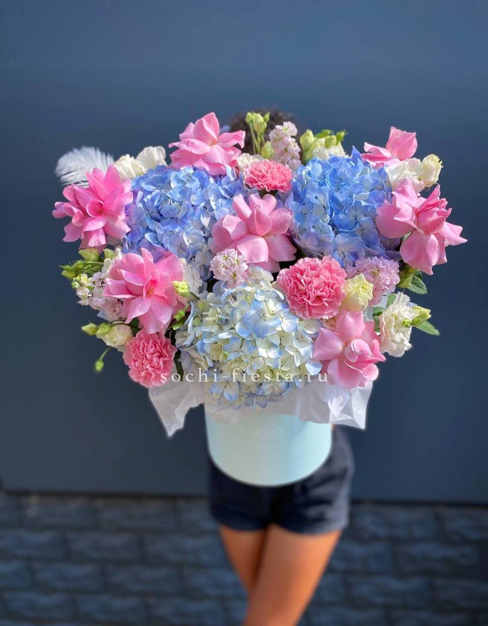 Гортензия и пионовидные розы задают плотную основу, маттиола или дельфиниум вытягивают композицию вверх. Объемная коробка вмещает многослойную структуру из разных форм и высот.