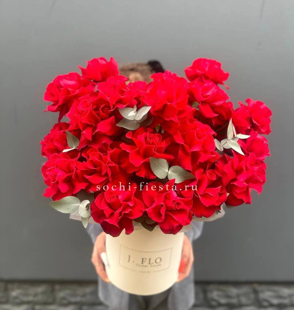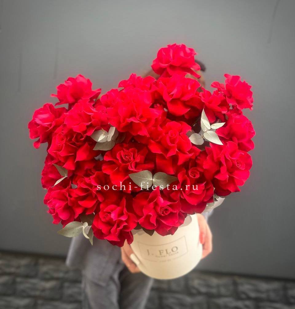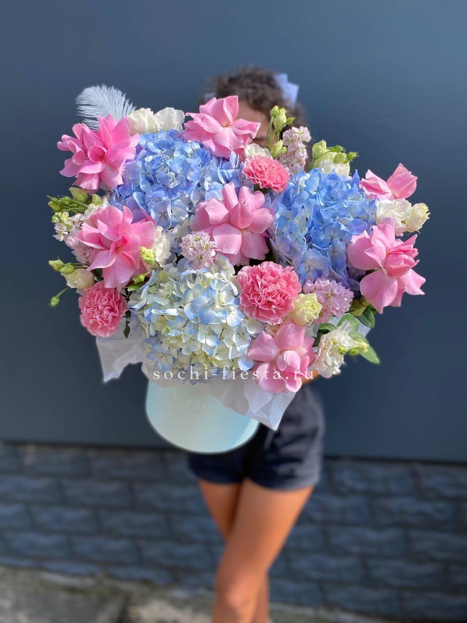 гортензия,  розы, маттиола или дельфиниум, хризантемы, пионовидные розы, эвкалипт,  цилиндр D16.